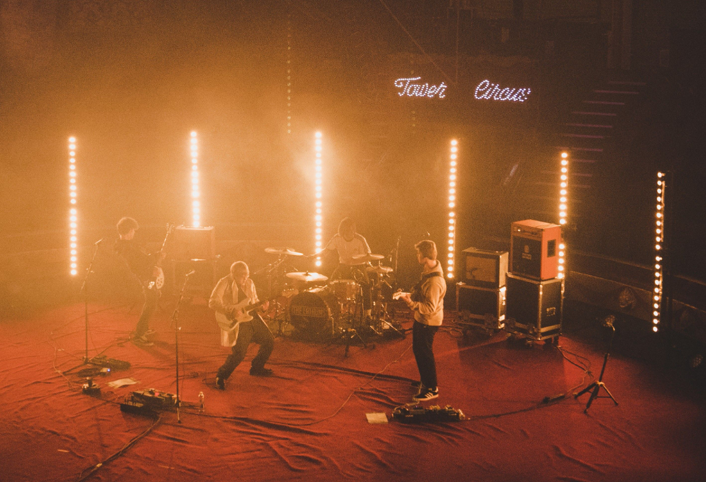 To the faded sounds of claps and cheers, The Lathums walk onto the stage dressed in neutral tones which are highlighted by the set’s translucent lights. The venue is adorned with cryptic circus remnants, complete with a round red carpet and a golden chandelier which envelop the scene in a lively atmosphere undeterred by the array of empty seats. The band stands, ready to perform as the ringmaster introduces them with a welcoming grin.
