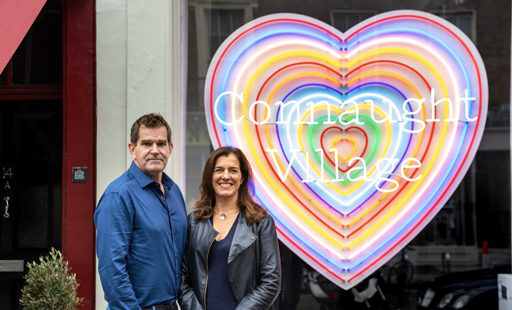 The artists Rob and Nick Carter are currently showcasing two fantastic neon art installations in the heart of Connaught Village, and are available for the public to see for free. Launched on the 22nd October 2020, the pieces are at 1 & 3 Porchester Place and 12 Connaught Street. Specifically commissioned by Connaught Village is a new piece built of 11 concentric neon hearts on separate circuits which will light up and change colour throughout the day. The husband and wife artistic duo are keen to keep London bright and illuminated this winter; we spoke to the couple about their latest work, what inspired them and the importance of art during a pandemic.