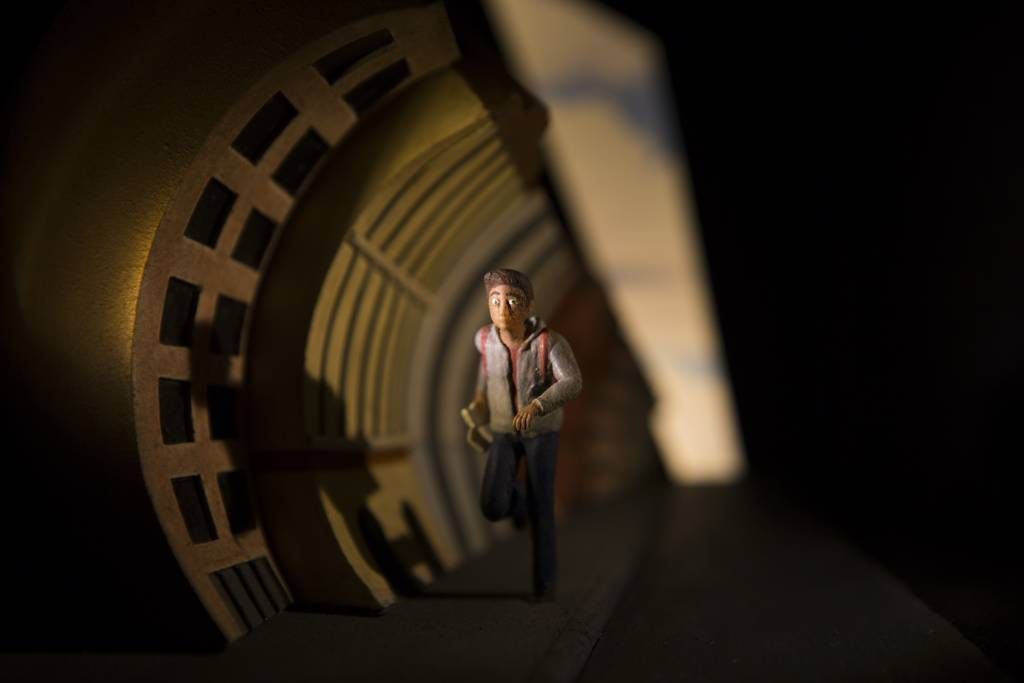 What further sets the Flight apart is the unique viewing experience: audience members are taken to booths, given headphones and set up to watch revolving panels containing detailed miniature models. The cumulative effect of the ever-moving carousel-like set, strong auditory design and isolated audience set-up is incredibly immersive and unsettling, inviting spectators to experience the tension and emotional beats of the script. In all elements the show is extremely personal, sweeping viewers away from the reality of sitting in the Bridge Theatre and taking them on the journey with Kadir and Aryan. The creative team prove their expert storytelling ability as every aspect of Flight works in tandem to elevate the plot and emotional experience for the audience.