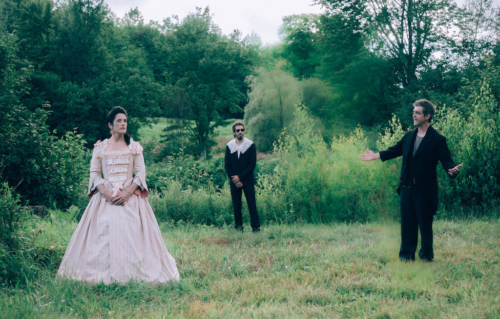 To give a better sense of proceedings: at the opening, a woman in white and a man in black stand remotely in a field. It’s a bucolic idyll and both are in period clothes. The static shot is tarnished with a slight blurring, as grass backs onto a forest, which in turn backs onto undulant hills and a heavy skyline, apprehended in cumulus splendour. The pair are caught in overwrought comic discussion about their lives and relative follies. We learn the gist: Solveig (Larissa Corriveau) is accosting her brother, who thinks of himself as a bit of a vagabond or dandy. This and the subsequent tableaux, all of which feature a trickle of witness statements, accumulate to form the protagonist’s trial and reckoning.