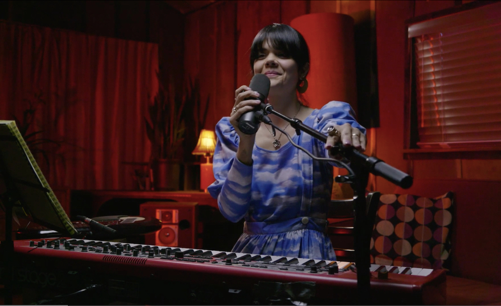 Bat for Lashes performs an intimate international concert from her Los Angeles home. In a pinafore dress in sky blue (complete with drifting clouds), she sits at her keyboard and synth station, contrasting against the warm red of her home background, a lamp glowing next to her. Her hands are adorned with bright pink nail varnish and numerous silver rings, completing her whimsical look.