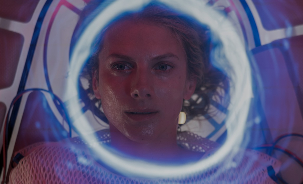 Viewers are introduced to the mysterious protagonist when she bursts through a plastic cocoon that entombs her body. It’s an arduous effort (that’s not without its symbolic significance) that sets the stage for the struggle to come. The lights finally come on, illuminating the confined space alongside the myriad of wires and tubes attached to the woman’s body, and the audience is introduced to the pod’s AI, named MILO (Mathieu Amalric), who informs her of the worryingly low oxygen levels. But he’s not so forthcoming with any other information to help solve the situation.