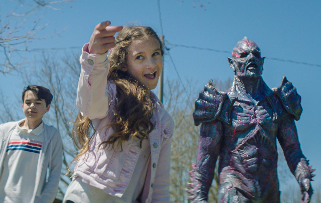 Millions of years ago, an all-powerful ancient being, hell-bent on destroying the galaxy, was imprisoned on Earth after being defeated by his enemies. That being is Psycho Goreman (Matthew Ninaber), or PG for short. He’s a hulking purple alien with a spiked back and menacing voice (provided by Steven Vlahos). He can pop heads, drive people to maddening insanity and devour his foes whole. The character is the stereotypical comic book villain turned up to 11, and he’s controlled by an amulet wielded by a bratty girl named Mimi (Nita-Josee Hanna) and her awkward brother Luke (Owen Myre).