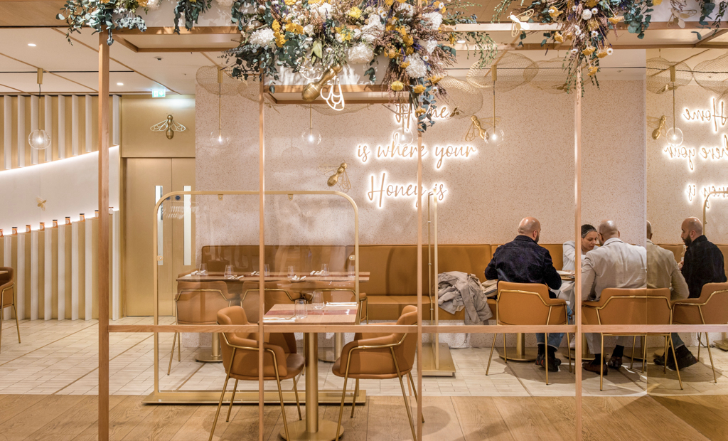 Polished wooden panels decorate the intimate dining space, the interior coloured according to a palette of soft tones recalling different honey hues. Bee sculptures unobtrusively scale the ceiling, crawling above vases of flowers and golden garnishes.
