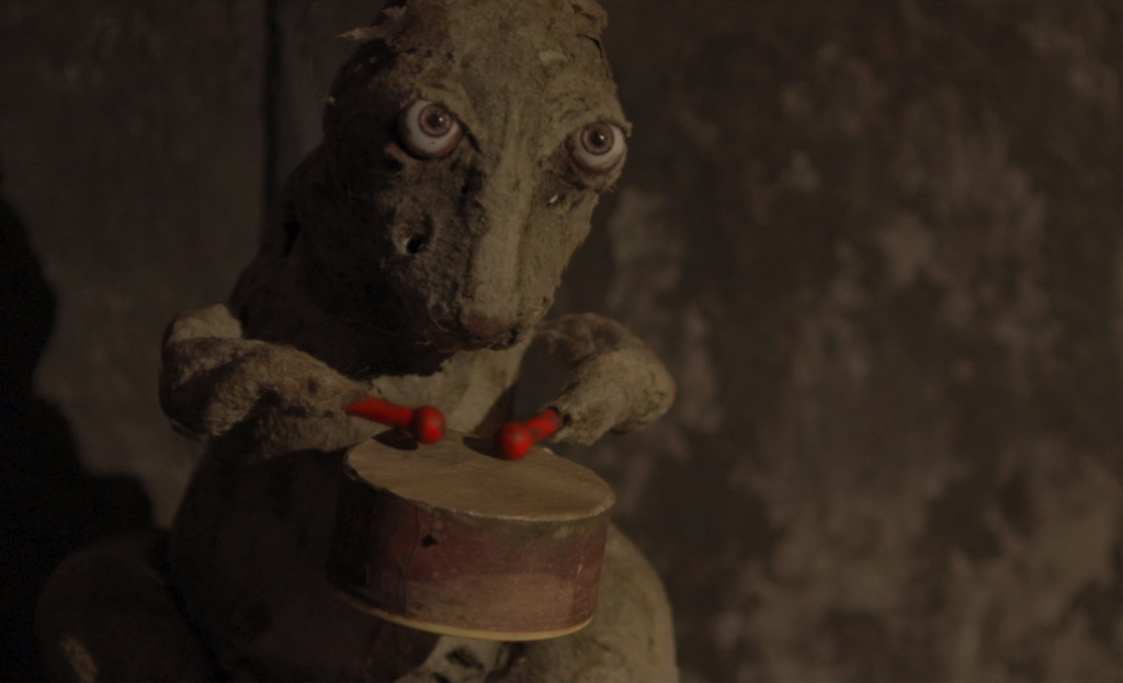 There he is! Yeah, it’s a nice thing to have. I should probably put it away in a box, ’cause I know one of these nights I’m going to hear it drumming, and there’s no batteries in it anymore! It used to have a little wire that travelled on its back so we could turn the switch on and off. But, yeah, often it broke down. I’ve heard great stories about the shark in Jaws – do you remember that story that it kept breaking down all the time? It’s the same with the bunny. The mechanisms were so old that you’d say, “Action!”, and he’s supposed to drum, but just one of his hands was drumming, so you’d quickly try to open him up, find which wire is broken, and one of the plastic cogs in his arm had cracked. He was the most difficult actor that we had in the film, for sure! And actually, he doesn’t work anymore, now he’s completely broken. The last time he drummed is in the film; it’s when Leila [Sykes, who plays Olga] is coming down the stairs and he’s drumming in the dark. We did it, and it worked, and we had the take, then I said: “Okay we’ll get one more just in case, just for safety.” And I said, “Action!” and he just refused to drum. That was it, he never worked again.