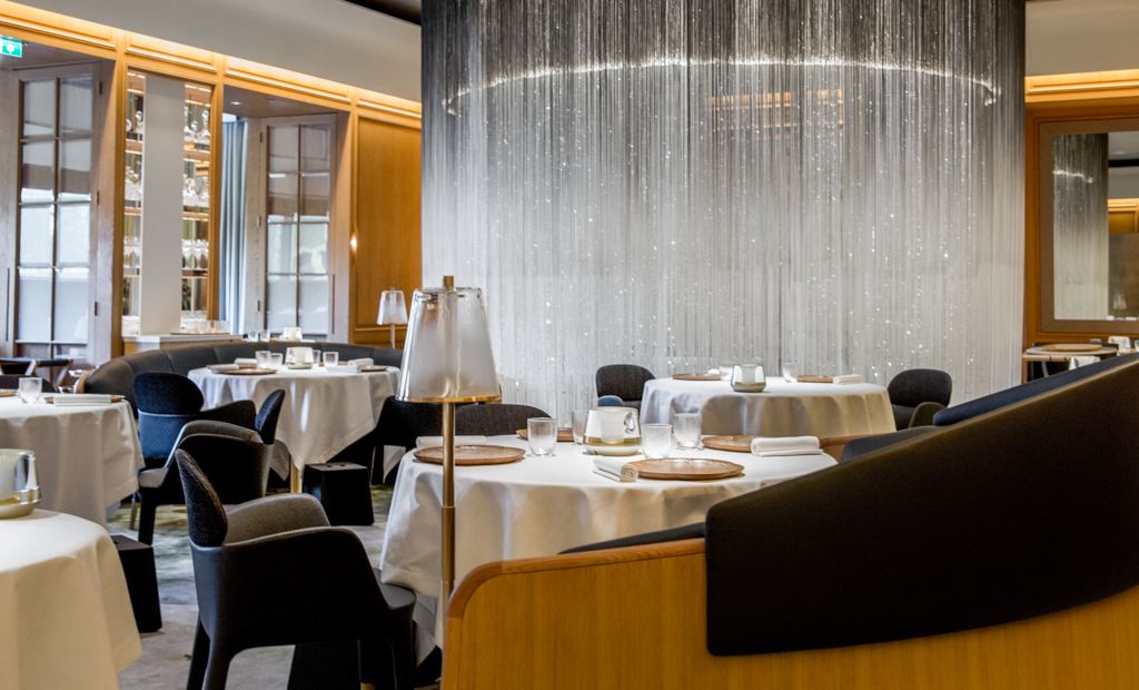 To get to the dining room itself is an exercise in self-restraint for lovers of luxury food: we must first pass Tom Booton’s acclaimed The Grill at the Dorchester and then take a stroll between the gilded pillars of The Promenade, the hotel’s lavishly carpeted and tunefully clinking tearoom. But the real sensory feast begins when you reach the recently reimagined restaurant space. The most impressive addition is undoubtedly the Table Lumière, which exclusively envelops guests within an Avatar-esque luminescent fibre-optic curtain. But while this feature asserts itself as the focal point, we are happy to be seated in another playfully designed space, which is inhabited by lush plants and a living wall that breathes organic energy into the room.