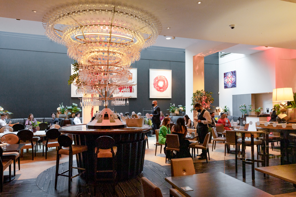 Further down this sprawling space, we find our table tucked away in an ideal spot: above our booth is a skylight and ahead of us stands an impressive circular counter displaying bottles of gin, with glasses of various sizes towering up toward the ceiling in a cylindrical formation like a shimmering tree. It’s beautiful in the way only highly impractical things are – part of me wants to ask for the most obscure drink I can think of just to see the waiter precariously scale the trunk.