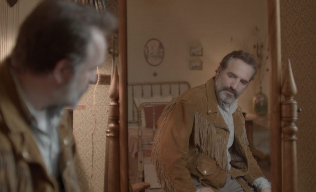 Georges (Jean Dujardin), arrives in a cloud-covered rural French town. Although the details are never fully disclosed (nor do they need to be), it appears that his marriage has recently ended, and he simply got into his car and drove. He parts with a vast sum of money to buy a vintage (deerskin) leather jacket, and creates a committed though unconvincing backstory for himself: that he’s a filmmaker working on a project. His lie almost clandestinely becomes his goal, which is handy, because it works in conjunction with his jacket’s goal: to be the only jacket in the world.