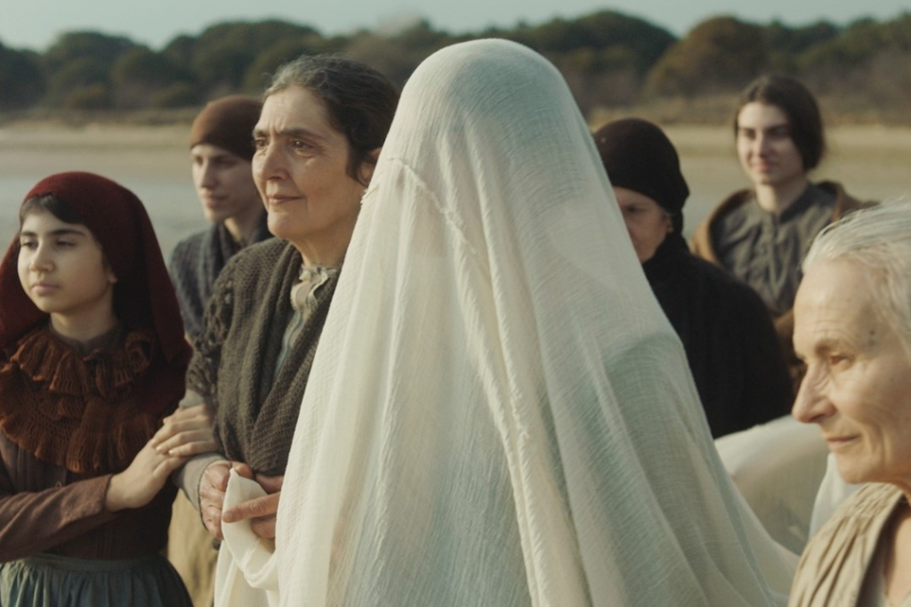 Mostly the references were not properly cinematographic, but more pictures, photography. Especially with the costume designer and with the set designer, we found two or three amazing books of pictures from my region, that were really good. The problem is that, of course, taking the pictures of poor people, farmers and things like that, were middle class photographers. So there is this sense of “striking a pose”. But especially for the costumes, what we found interesting is that, of course, the pictures were black and white, sepia. But in the past they put paint on it, to put the colour back. And so they would really pop. They were like, sepia, but then like a pink shirt, you know, things like that. So we used that to do the crazy things I was talking about. Detaching a bit from the historical way of putting down this thing. Like the bandit woman wears a collar, which is insane. I mean, she looks like a cardinal in a way. And Lynx has this red scarf, which we love because it reminds us of the partisans in Italy during the Second World War. Things like that.