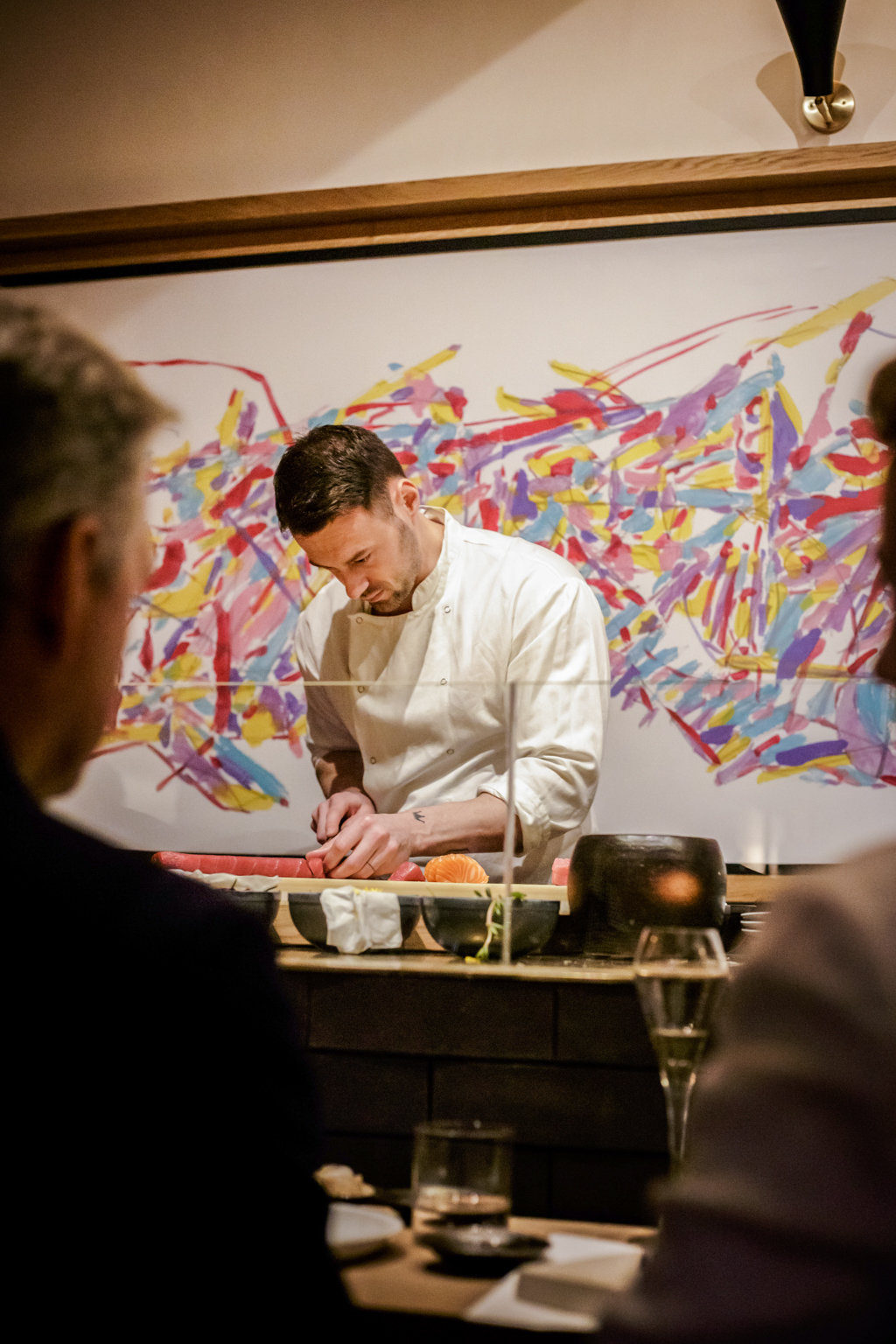 Downstairs at Sachi, a door festooned with flowers opens out into a dark yet lively space. The bar team are ready to greet us, but we are drawn straight towards the sushi counter, which sits in the spotlight, illuminating two chefs who banter against a background of abstract art (pulling off the admirable but perhaps inadvisable feat of multitasking with knives). We are warmly welcomed by a small army of staff, each of whom seem to know exactly what you need at any given moment – sometimes before you know it yourself. It’s a real testament to Japanese hospitality, instinctive in a way that might be unsettling if it weren’t so impressive.