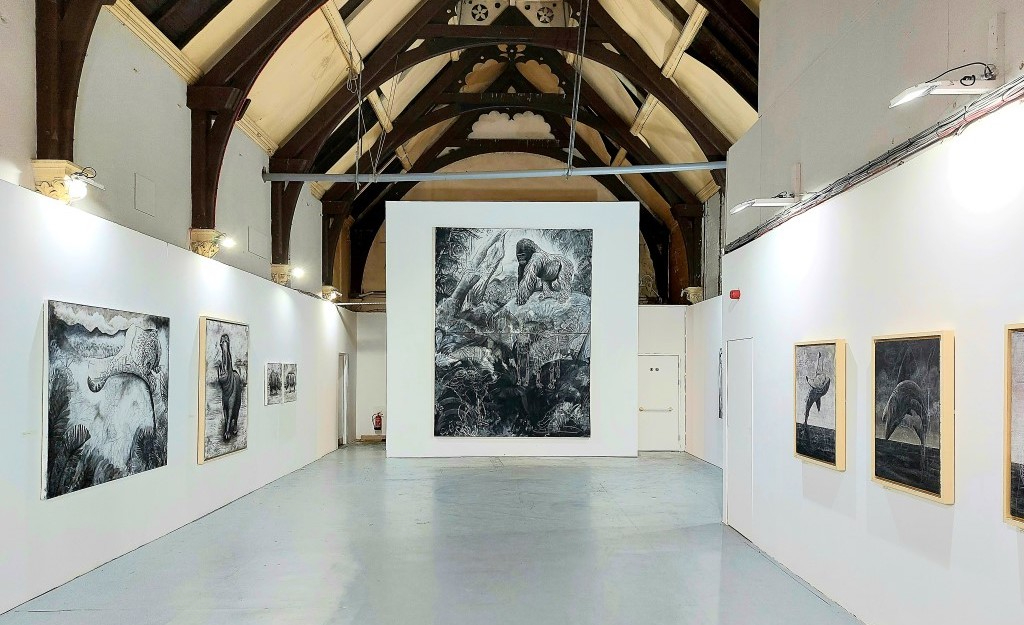 The centrepiece and main focal point of the show is undoubtedly the monumental drawing of an especially regal-looking gorilla, surveying his domain from a rock in a habitat teeming with plants, back-lit by the indication of a glowing sun. Closer inspection reveals the inclusion of two skeletons rendered in the centre, one human, the other a gorilla emerging from the undergrowth. It’s a clarion call to take action in order to prevent these magnificent animals – demonised by Hollywood as woman-kidnapping “monsters” – from seeing their habitats and communities destroyed. The artist made this impressive, large work in front of the visiting public in the first week of the exhibition, leading to numerous interesting conversations. Apparently, the public “picked up well on both the humour and the darker content”.