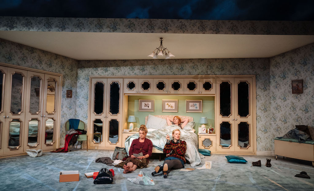 The central performances are excellent. Lucy Black is tightly wound as the oldest, Teresa, the one who did the caring for their mother as she suffered from Alzheimer’s. Laura Rogers is Mary, the clever middle daughter who is a doctor. Carolina Main is the youngest, Catherine – at 33 still with the overblown and narcissistic body language of a teenager, rushing in to gabble about her recent purchases. It’s difficult to nail the energy and histrionics of the perpetually unreliable like this and Main does it brilliantly, at one point sliding backwards off the bed like a limp toddler when the conversation bores her.