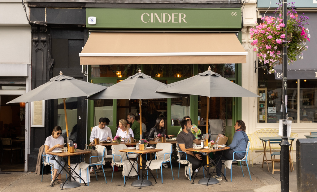 There’s a spot along Belsize Lane where the pavement is crowded with tables, chairs and smiles. The outdoor seating belongs to Cinder, a cosy restaurant in North London featuring dishes whose ingredients, in one way or another, have been passed through a lively flame – hence the name. The door is almost invisible, like the adjacent wall, as the space opens up to the street. Once past the threshold, though, the intimate and delightfully bright interior welcomes the guests in for what promises to be a relaxed and tasty lunch.