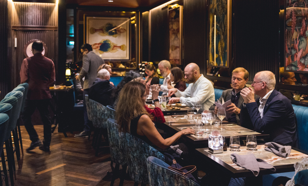 Firstly, it’s in Mayfair – seductive area in itself with a high price tag associated with every metre of real estate. Brilliantly, though, the prices here are rather reasonable, averaging £10 for a starter and £15 for a main. Interiors are slick: a slim space offers seating on either side and a low-lit bar tucked away at the back. Dark wooden flooring, soft lighting, velvet booths and shades of peacock blue contribute to a sensuous ambiance – foreshadowing, perhaps, the oncoming titillation of the tastebuds.