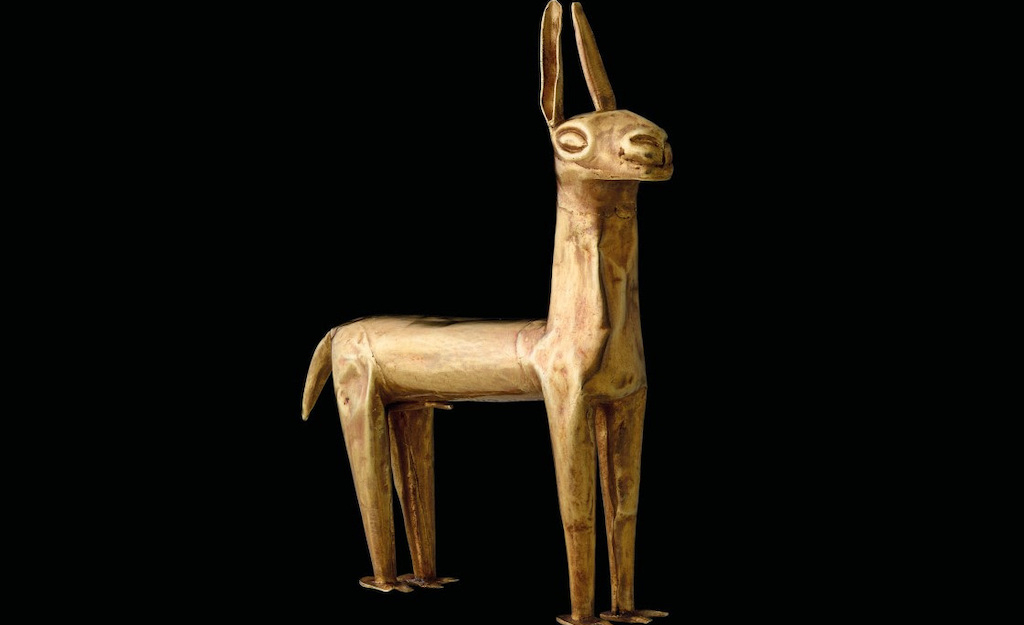 It shows the geoglyphs of the Nasca people: giant artworks made by removing the top layer of soil to carve lines into the earth, only visible from above. A three-minute video filmed by drones, shows these mysterious, gigantic images as the creators intended them to be seen. The largest is two kilometres long. There are ceramics of some of the giant images too – a “human killer whale” is especially memorable, given human-like attributes such as holding a knife, portrayed as though returning victoriously from battle. Much of the artwork is hallucinatory, owing perhaps more than a little to the fact that chewing coca leaves and imbibing hallucinogenics was central to daily life. What’s striking is how modern some of the ancient artwork is: the vibrancy of the natural dyes used in the textiles, the vivacity of the depictions. There is a bold sculpture of a contortionist, who had special status in Andean society. A tiny gold statue of a llama captures all of that creature’s character in its jauntily erect ears alone.