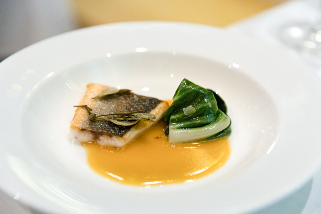 The cheeky vibes continue with the next course: a Fried Poussin, Preserved Lemon, Cordyceps (another type of mushroom) – a dish described by the maître d’ as “a sort of posh KFC”. The thick sauce surrounding the fried poussin is heavenly: herby, sweet, and again indulgent, with refined flavours of parsley, chervil and dill. Shame we have to use a knife and fork, really. Next, we veer away from cheeky and head back to classic with a beautiful fish course: Aged Market Fish, Miso Beurre Blanc, Swiss Chard. The 2019 Quinta da Boa Esperança Sauvignon Blanc this was paired with was the most memorable wine of the night, legitimately tasting of bell pepper to cut through the butteriness of the fish.