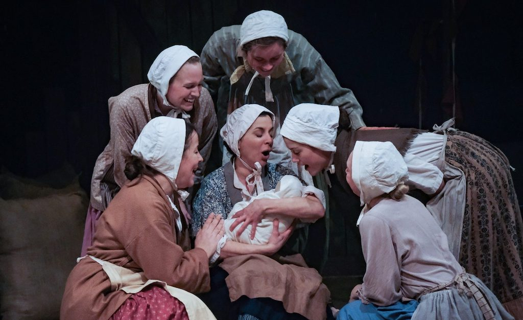 Unfolding in the rural village of Polstead, Suffolk, the musical show begins with a scene that Flintoff describes in her stage directions as the “un-murdering” of Maria. The protagonist, played by Elizabeth Crarer, presents herself on stage as a corpse, with mortal wounds marring her body. Her lifelong friends gather around her and begin to clean her up while she speaks directly to the audience. By addressing the public’s grim fascination with the murder immediately, the story can move on to form a three-dimensional picture of Maria and the lives of the women around her. Her murderer is reduced to a shadow as the audience’s attention is drawn to her joys, struggles and sheer determination to keep going in spite of the many adversities she faced.