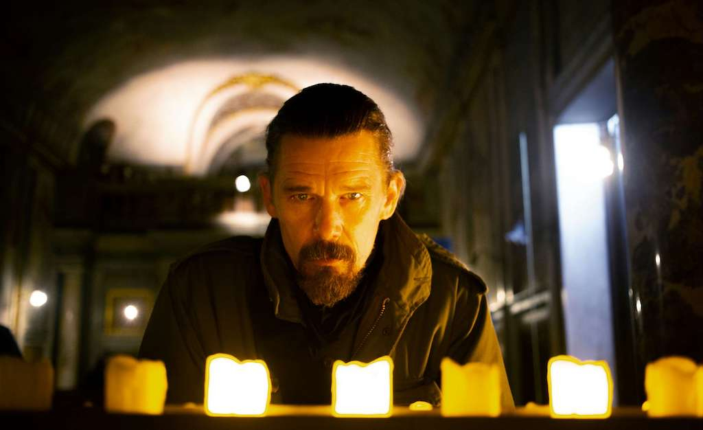 Zeros and Ones, starring Ethan Hawke, is bookended by clips of the actor (as himself) earnestly and inexplicably talking about the film, and mentioning how he was excited to see the director’s (Abel Ferrara) cinematic reaction to Covid-19. It’s as though someone accidentally included a clip meant for a DVD special feature with the theatrical release. If Ferrara had thought his pandemic project through, he might have realised that cinemas would largely be closed for his film’s release, meaning most viewers would watch it at home on an LCD screen with in-room glare. If so, perhaps most of the action wouldn’t take place in almost near darkness, meaning the most prominent visual image of Zeros and Ones is a reflection of the viewer’s own face.