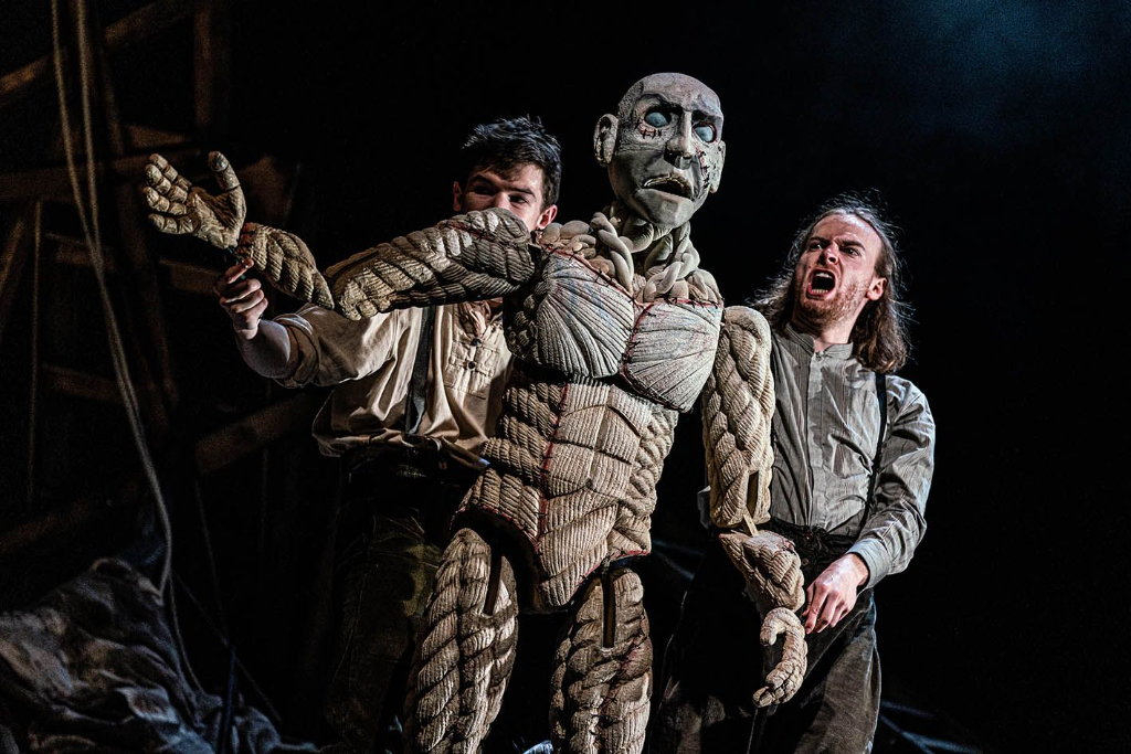 Director Eliot Giuralarocca employs a variety of inventive techniques: the Creature is portrayed using a bunraku puppet (similar to those used in the War Horse and The Lion King). Designed by Yvonne Stone, the anatomy of twisted rope cleverly evokes the muscle and sinew of the human body beneath the skin; its skeletal face, with a malevolent crook in the brow and blank eyes, is eerie and unsettling. The puppet is handled with great skill and nuance by the actors, eyes blinking, chest breathing, giving the impression of life or whatever dreadful imitation the wretched brute inhabits. Billy Irving gives the Creature the surprisingly eloquent voice he has in the original novel – despite his monstrous appearance, he is erudite and heartbreakingly aware of his own monstrosity: “I am not dead… not anymore,” he laments in one memorable line.