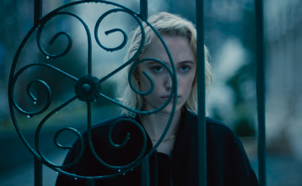 Having relocated to Bucharest with her husband, Francis (Karl Glusman), Julia (Monroe) is at a loose end. With little to occupy herself while Francis works long hours, she begins to sense something off-kilter, becoming convinced that a man (Burn Gorman) living in the apartment block opposite is watching her. She strains her eyes to see only an outline or a faint figure distorted by net curtains. These are evocative long shots which tap into a universal paranoia when one is left to one’s own devices of an evening: is that silhouette outside my window a branch or am I being watched? Shortly thereafter, news of a serial killer in the city begins to emerge, with the victims being exclusively young women with their throats slit, sometimes so forcefully that their heads are cut off. Julia then becomes gripped by the possibility that the man opposite is the perpetrator, and begins to vehemently fear for her own safety.