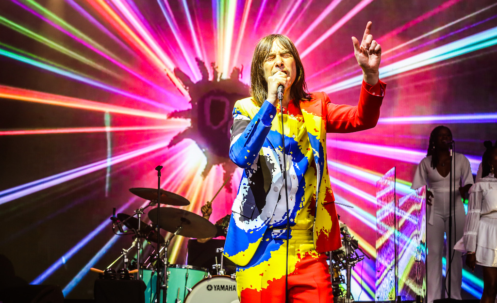 Slime-green paint splashes slither down an animated screen, setting the stage as members of Primal Scream, dressed in white, sing their soft, psychedelic, dance-rock. “We want to get loaded! We want to have a good time!” the band exclaims as the crowd cheers. The music may not resonate with a younger crowd unfamiliar with the material, but this al fresco performance delights longstanding fans.