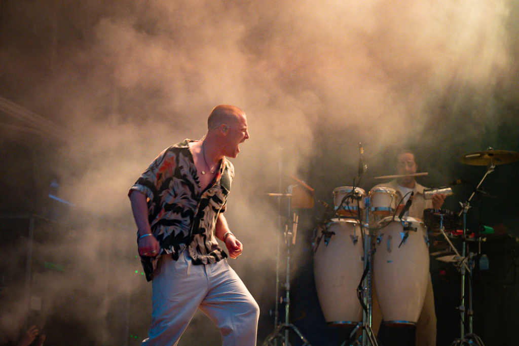 Crystal Palace Park has a kind of faded, expansive grandeur that was enhanced by the scorched grass the current climate has created. South Facing Festival has been set up where the ground dips in a natural amphitheatre, the stage over a pond whose goose inhabitants seemed, if not massive fans of the music, then pretty ok with it, as they stuck around. Maybe they were just too bamboozled by the eclectic funkiness of the Avalanches to up wings and take to the sky. Anyway, it was a nice little setup, one stage with good views all around, surrounded by bars and with food stalls on one side. There was one selling delicious-looking plump pizzas, a hot dog stand that included a vegan option and a stall for vegan junk food which sold deep-fried seitan burgers with the option to add a vegan mac ‘n’ cheese made with nuts as an extra topping. Had a too-tight skirt not been opted for, they would have all been eaten with no remorse – but linen is an unforgiving fabric.