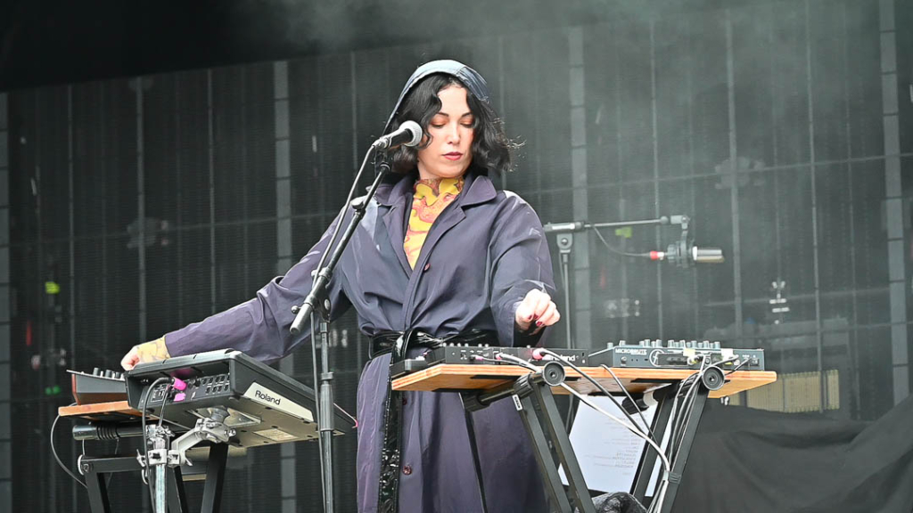 Welsh electronic producer Kelly Lee Owens came on stage politely declaring she would take the crowd on a journey, “Is that ok?”. Her cerebral yet heavy techno/dream pop mix and hypnotic visuals went down well with the crowd. She came on stage like a boxer, with a black hooded robe which revealed a high 00s orange mesh dress. She created distorted, enigmatic vocals, running her voice through oceans of reverb and a sound that built inexorably to a fist-pumping climax.