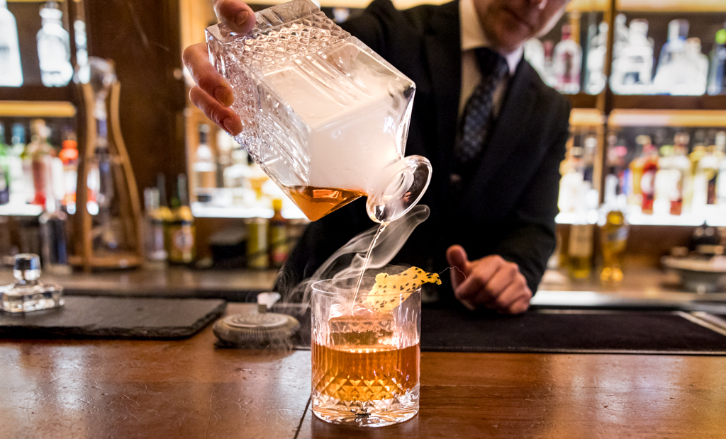 Expect no traditional recipes from the back-lit counter: the drinks are original and strikingly satisfying interpretations of some of the best-known tipples, starting from the Old Fashioned. The bourbon is infused with sesame oil, which gives a velvety texture to the liquor and a slightly sweet aftertaste. The smoking happens in a separate closed bottle, instead of around the glass, so flavour permeates the liquid well. Sipped while alternating bites of pineapple and sesame seed leather, it glides through the mouth and the throat like an elixir.