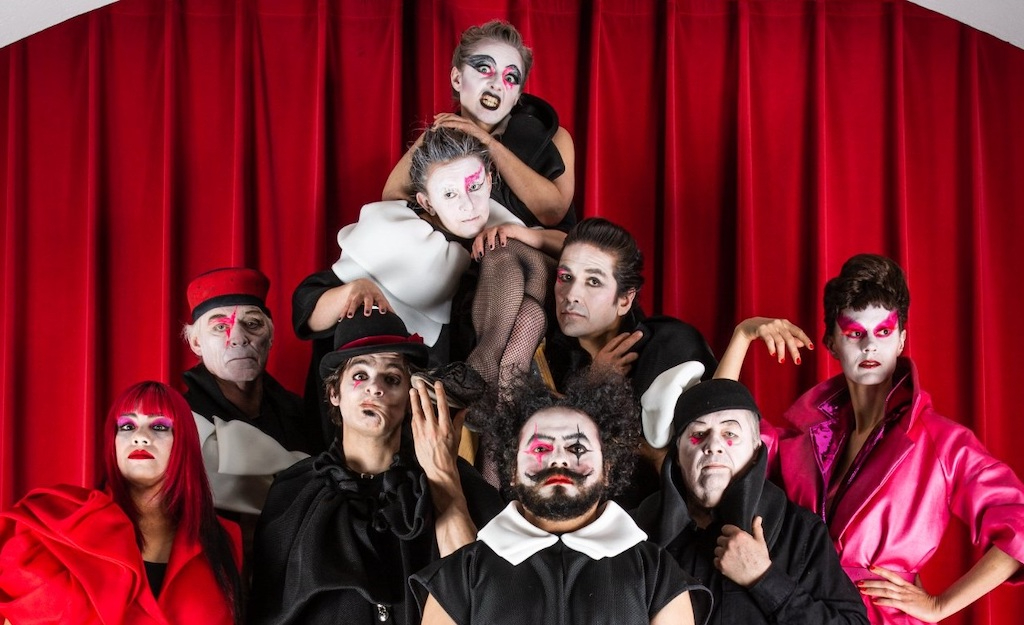 Performers wear white clown makeup with colourful detailing. The compere, Nora Tinholt, smiles at the audience with crazy, wide-open eyes covered in black all the way from her eyelids to her temples, and fluorescent pink eye bags that look like bloody tears – it is a suitably creepy effect. This is teamed with statement costumes: one character wears a full-body clown suit with wide balloon trousers, all black with a ruff-like white collar. The singer, Schreuder, is in a pink plastic dress that looks like David Bowie had a baby with Magenta from The Rocky Horror Show; she wobbles in some 20-inch razor-sharp platform heels (they look impressive, but she can barely walk). Mo Benchenllal’s costumes place the action in an underground, otherworldly space.