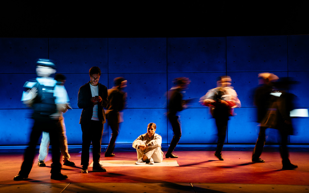 The music comes in and out in key dramatic moments. Given the strength of the dialogue, often, the volume seems to superimpose in a forced, unnecessary way. The stage is free of props and fixed settings, occupied only by moveable blocks, which allows plenty of space for the cast to move. And, indeed, the performers’ lines are often accompanied with fluid choreography by Carrie-Anne Ingrouille that removes any possible stiffness, linking sequences in choral tides.