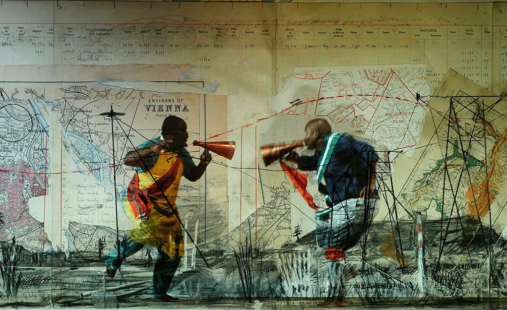 Kentridge has frequently brought into focus the effects of colonialism in Africa. In a series of charcoal and pastel drawings, he draws directly from old photographs, exemplified by Victoria Falls (Colonial Landscape) (1996). The landscapes were being viewed by white Europeans as beautiful wildernesses without people. Elsewhere in the exhibition, one comes across large mohair tapestries of migrants superimposed on top of maps to conjure the legacy of colonialism.