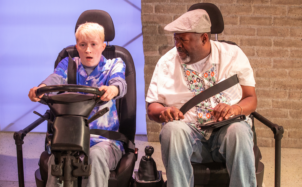 Aymer commands the laughs early on. The actor exhibits excellent comic timing and successfully conveys an array of subtle facial expressions and mannerisms that immediately invite viewers in. Later, these delicately portray what lies beneath the brash façade: a man who is experiencing extreme turbulence in his private life. Kafflyn, who makes his stage debut, is effortless. Embodying the nerves of both a learner driver and an uncertain teen, he utilises every tool in the actor’s kit – facial expressions, voice and body language – with utter aplomb. His rapport with Aymer feels organic and natural, allowing for the darker and more dramatic moments of the play to carry greater impact.