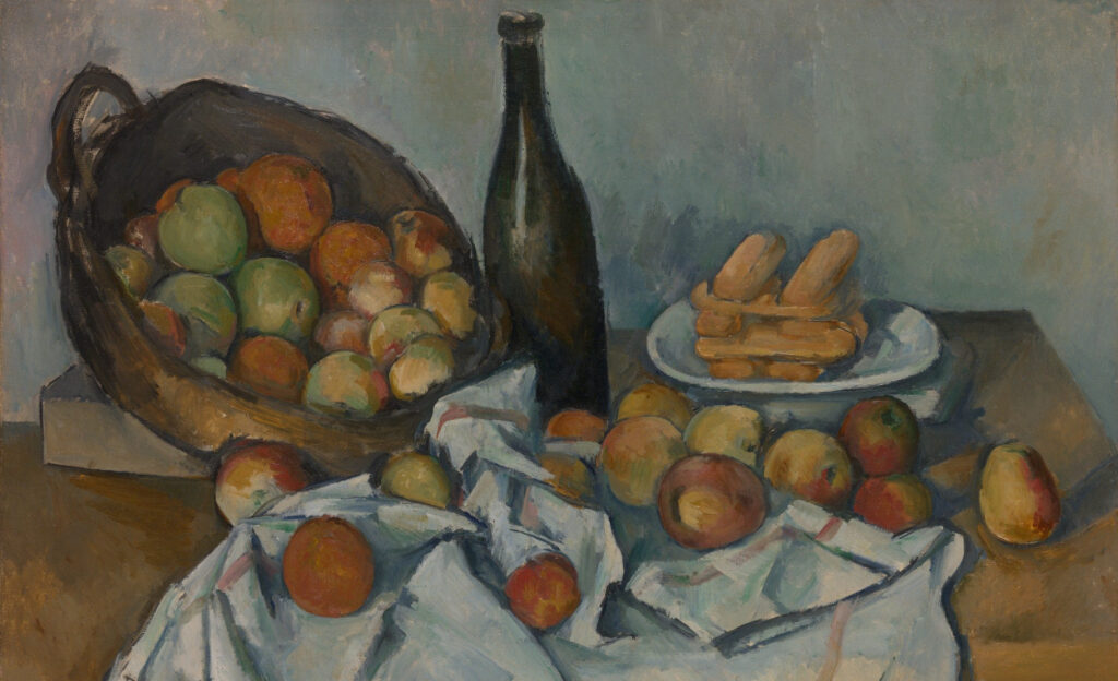 Beginning with a self-portrait, the display traces the artist’s life and how his relationships helped him develop his personal style and start to “become Cezanne”. In the second room, the left wall explores how Cezanne’s relationship with childhood friend Emile Zola (who encouraged him to leave Provence and move to Paris to live an avant-garde life) influenced Cezanne’s darker early works, including The Murder with its bulging culprits painted under a billowing black cloud. On the right, Cezanne explores his influential relationship with fellow painter Camille Pissarro, who encouraged the artist’s more colourful and warm style.