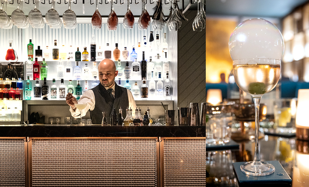 The menu includes a selection of spirits and bar snacks, with the new Once in a Lifetime cocktail list accompanied by hand-painted illustrations for each drink. The experiences chosen for this compilation range from spectacles of nature (such as an eclipse and the northern lights) to intrepid pursuits like skydiving and safari. Browsing the options, our curiosity is tickled by another table’s selections. We order the same, and the presentation is incredibly exciting: Kasumi arrives in an unassuming martini glass, which is soon to be topped by a misty bubble.