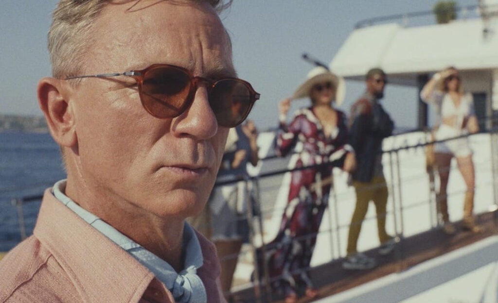 The rustic aesthetics of Harlan Thombrey’s gothic mansion are replaced by the outlandish tech fetishism of billionaire Miles Bron’s (Edward Norton) private Greek island, the private quarters of which is the imposing structure of a literal glass onion which comes to personify all great murder mysteries alike; there are multiple layers to be pulled back, but the centre is right there, coddled in plain sight. It is a striking, inevitably enduring piece of iconography, as is, in fact, the entire film. It’s meticulously constructed sets which, in perhaps the most subtle of subtle nods and winks, evoke a Bond villain’s lair, and Jenny Eagan’s sumptuously observational costume designs are deliciously shot by Steve Yedlin, whose work locks in the value of seeing Glass Onion on the big screen, while Bob Duscay’s editing moves the narrative along in a spritely, consistent pace, even when it reaches its most dazzling and audacious peaks.