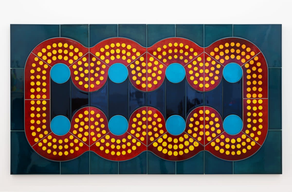 Lubna Chowdhary’s series of ceramic tiles (Signs, 2022) achieves a depth of colour in the glazes, glossily lucent, and precise geometry in the design. Emma Hart also works in tiles, creating “windscreens” (various, 2018) of ceramic tiles fitted into metal folding frames. The tiles work on both sides which must have taken some planning and skill. One side is the view into the car, the other view is what the passengers in the car would see, so there are manically zig-zagging roads on green hills and lights through pouring rain. The series is mysterious and ingenious.