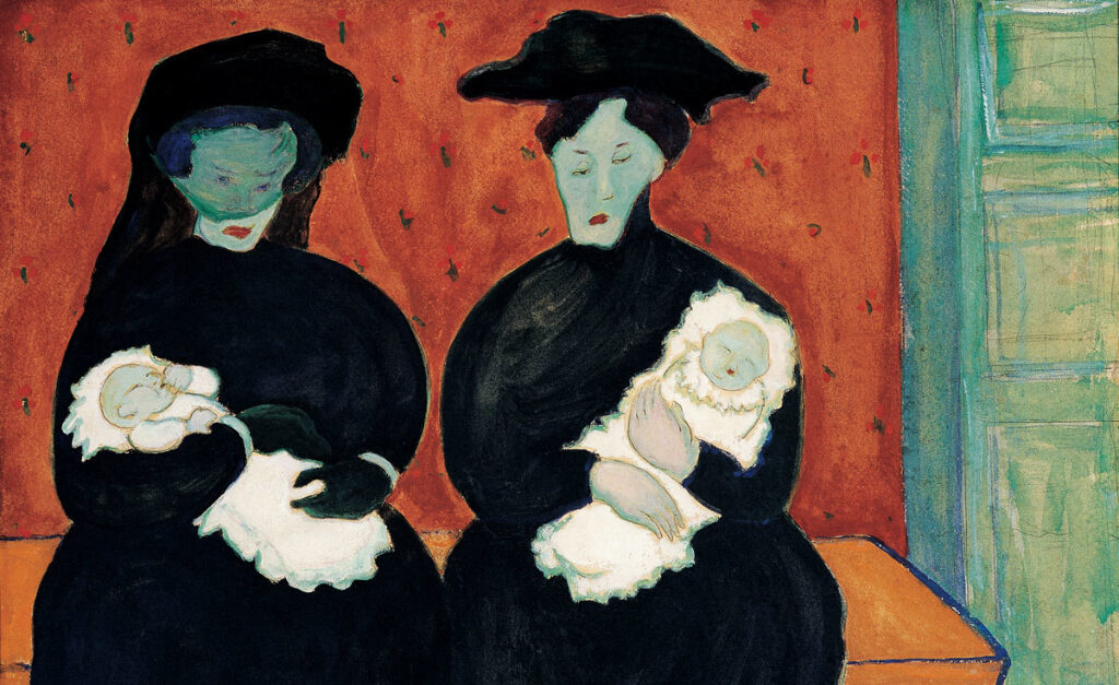 Some of the works draw uncomfortable associations between maternity and mortality. Twins (1909) by Werefkin makes new mothers look like they are in mourning: black clothes, one with a veil over her face, and babies and mothers with a similar sickly pallor. It’s fair to say that the mothers don’t look especially thrilled. Werefkin was a Russian baroness who wrote, mystifyingly to modern minds perhaps, “I am a woman, I lack every ability to create.” She met artist Alexei Jawlensky and together they travelled west, Werefkin giving up her painting for a decade to support Jawlensky financially and emotionally. Accompanying them was her young maid, who soon gave birth to Jawlensky’s son. That might explain some of the ambivalence towards motherhood here. As a thanks for all her support to the detriment of her own ambition and work, Jawensky eventually left Werefkin for that maid.