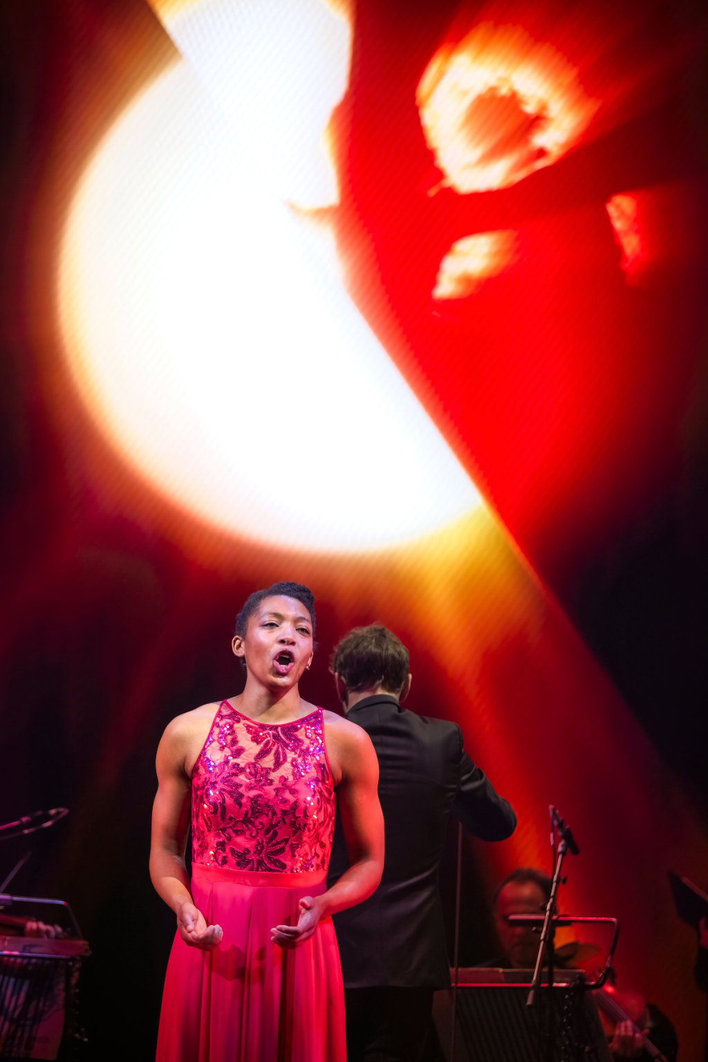The choreography by Tom Jackson Greaves, executed by three dancers moving both on stage and among the stalls, sinuously weaves through the lyrics. In the background, slotted between the two wings of orchestra and choir, a screen regularly captures the eyes of the audience: following the overall rhythm, the projected graphics (by the international design studio Flora and Faunavisions GMBH) assume a monumental aspect for the first part (a rising sun in the overture, an eclipse, a desert stone), changing, then, into colourful dynamic rays for the second part, and into blurred shapes in the third segment. It very much mirrors the engagement of the production: slow and somewhat distant at the beginning, picking up pace and vibrant from the middle onwards. The abstract figures are recalled visually across the whole space in clever coordination with the lights.