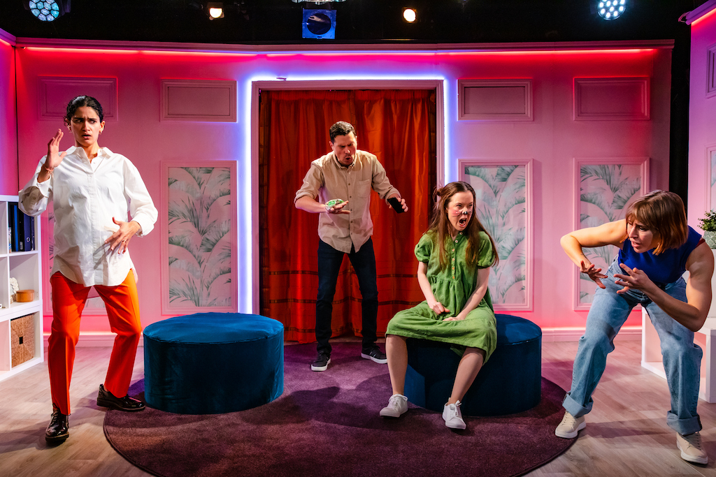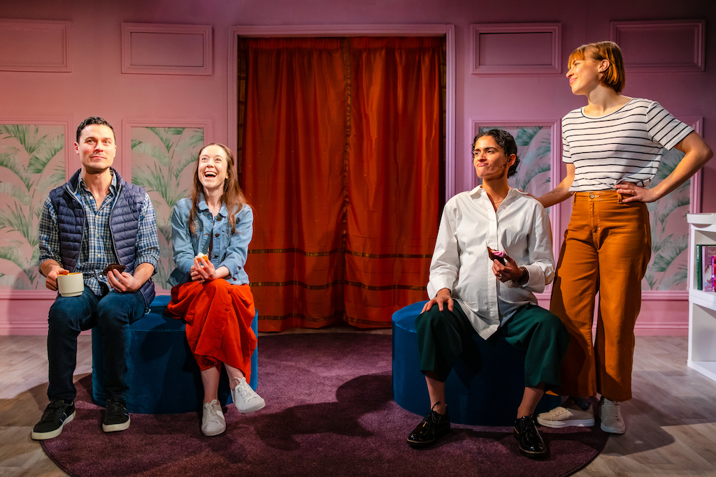 The play starts with two sets of parents, Matt and Sarah and Amira and Chloe, meeting at the latter’s house. Lucas and Samir are their respective sons, both nine years old. They’re best friends. They kissed. Clueless Matt – who is totally fine with it, although it is not clear what he is fine with – clumsily and unwarily walks into a “nature versus nurture” discussion, claiming that Samir must have been the one who initiated the kiss, being the son of a lesbian couple. His wife, brilliantly portrayed by Amy McAllister, is mainly worried about the other mums’ spitting hatred and bigotry on WhatsApp, preoccupied with preventing her son from becoming a social outcast, even if that means not inviting Samir to Lucas’ birthday party. The compassionate Chloe, who dreams of Range Rovers and white picket fences, tries to keep the peace – and keep the strong-headed (and pregnant) Amira from verbally annihilating everyone.