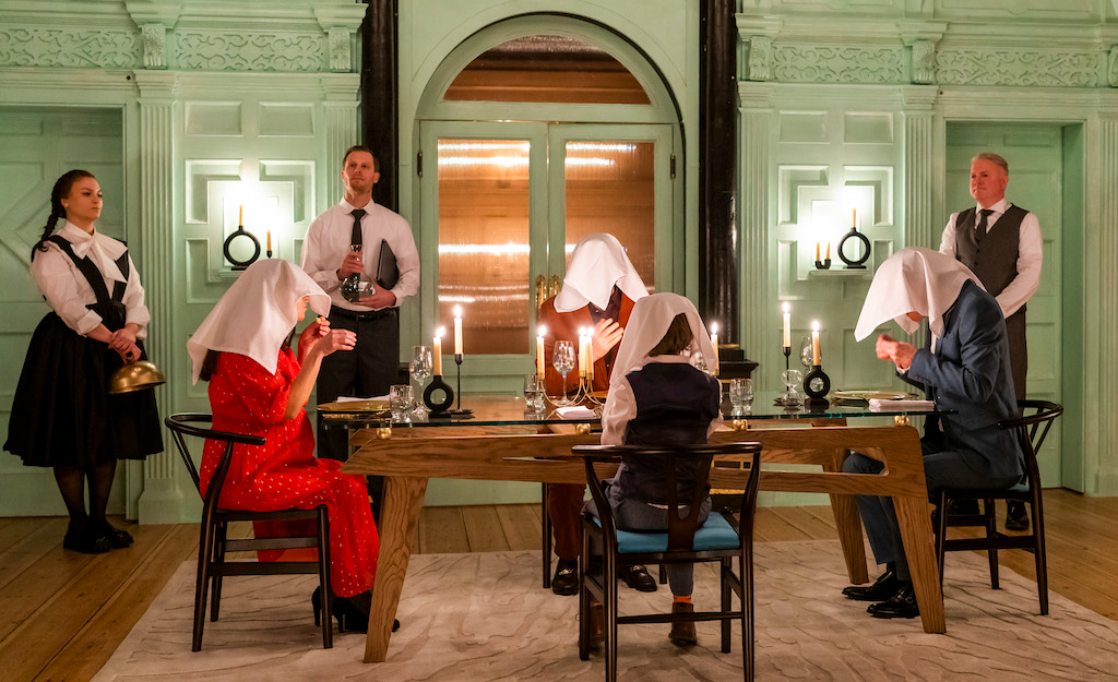 After the interval we are led to Bohemia in the Globe Theatre – an ingenious move to contrast these different places. Bohemia is more generous in space, the action taking place on a series of colourful trestle tables overlit by coloured bulbs. And here poor Antigonus (Colm Gormley) meets his fate in one of the more hilarious moments: chased and mauled by a silent, suave bear. (It has to be said, the bear was probably everyone’s favourite. Kudos to the designer, who managed to fashion both a teddy bear and ruthless killer in the same stroke.)