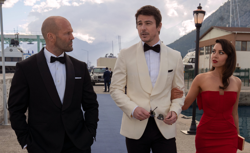 Alongside Statham – reliably and assuredly as ever playing the role of Jason Statham, in this case with the given name of Orson Fortune – is JJ Davies (Bugzy Malone returning to Ritchie’s orbit in a more central role, in which he just about holds his own as the slightly dim but loyal sharpshooter) and Sarah Fidel (Aubrey Plaza). The team’s leads take them to all sorts of glamorous locations, each dutifully introduced by establishing shots and labelled in true spy movie fashion. Their investigations lead them swiftly to a billionaire arms dealer, the more appropriately named Greg Simmonds, a deliciously sleazy performance from Grant, very much operating in the same mode as Fletcher from The Gentlemen.