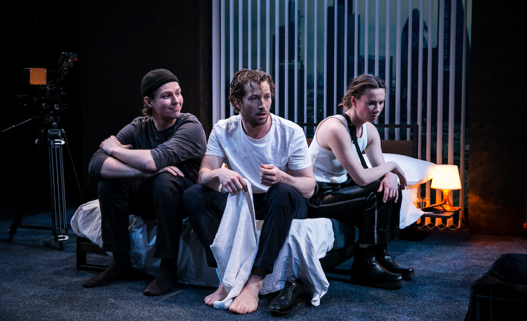 Tony (Henry Davis) is sprawled facedown on a hotel bed as the audience piles into the compact studio space at Park Theatre. As he wakes up to room service knocking on the door, it quickly becomes apparent that colleagues Marcus (Boulton) and Sarah (Louise Hoare) aren’t exactly legit. Rendering Tony unconscious, the two set up a video camera and lay out an array of foreboding looking tools.
