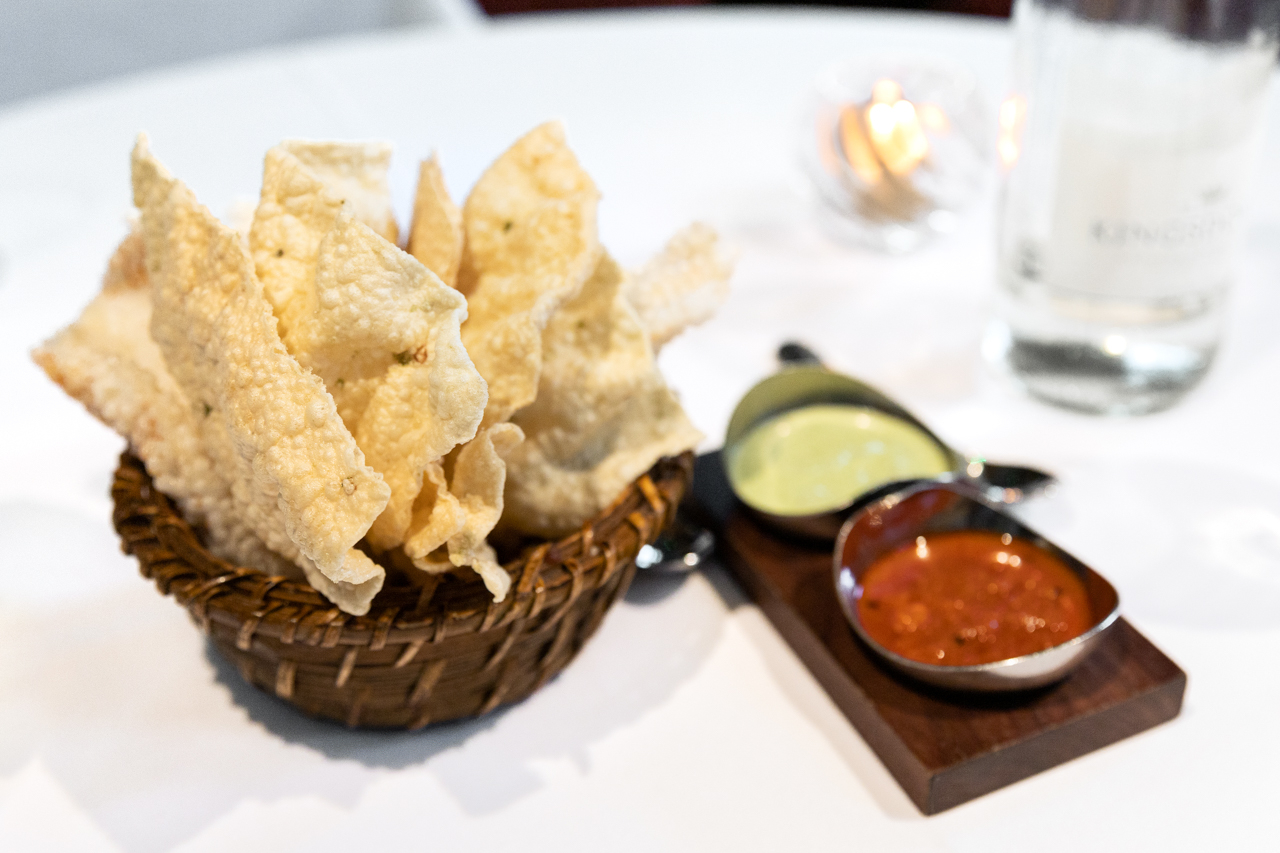 Next, we had a poppadom basket to whet the appetite. This included an assortment of roasted and fried poppadoms served with tomato and lemongrass chutney and a mint yoghurt chutney.