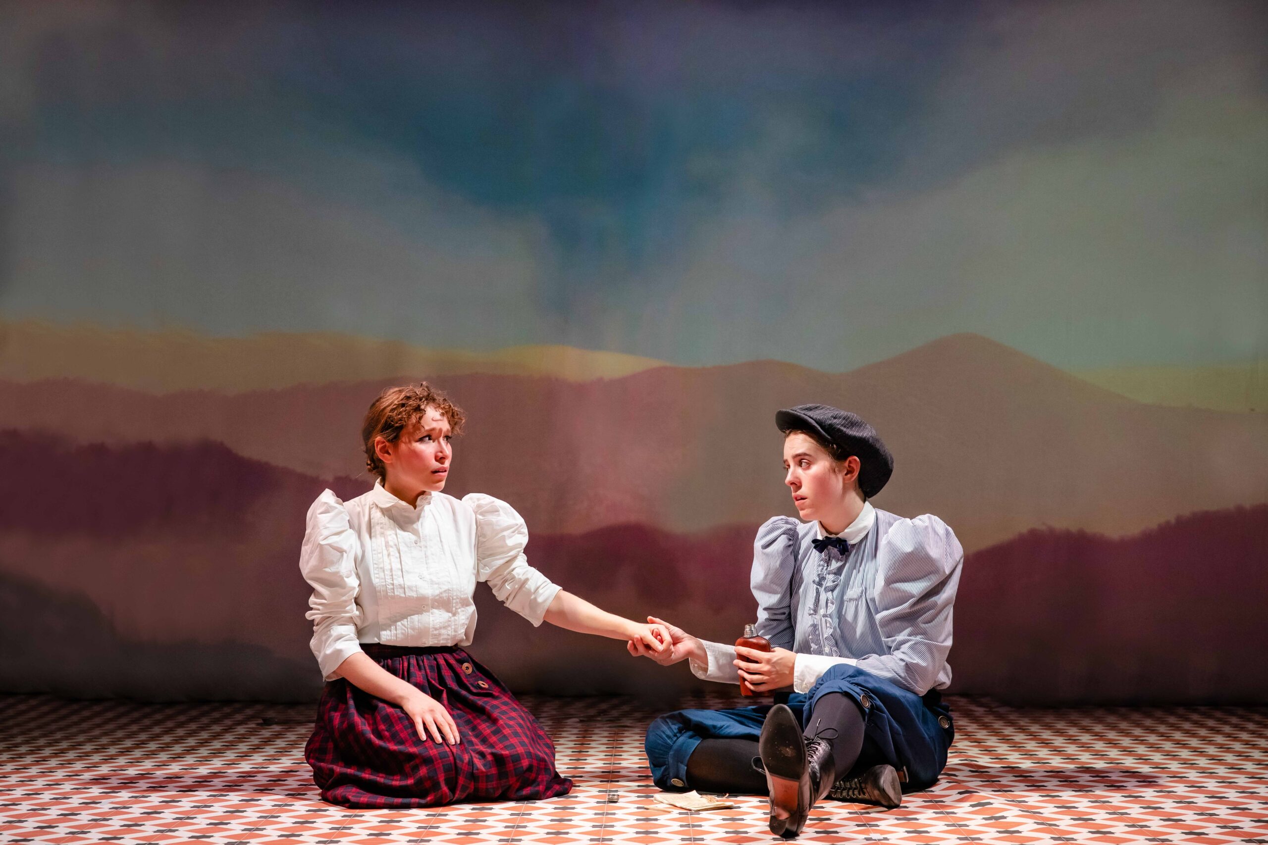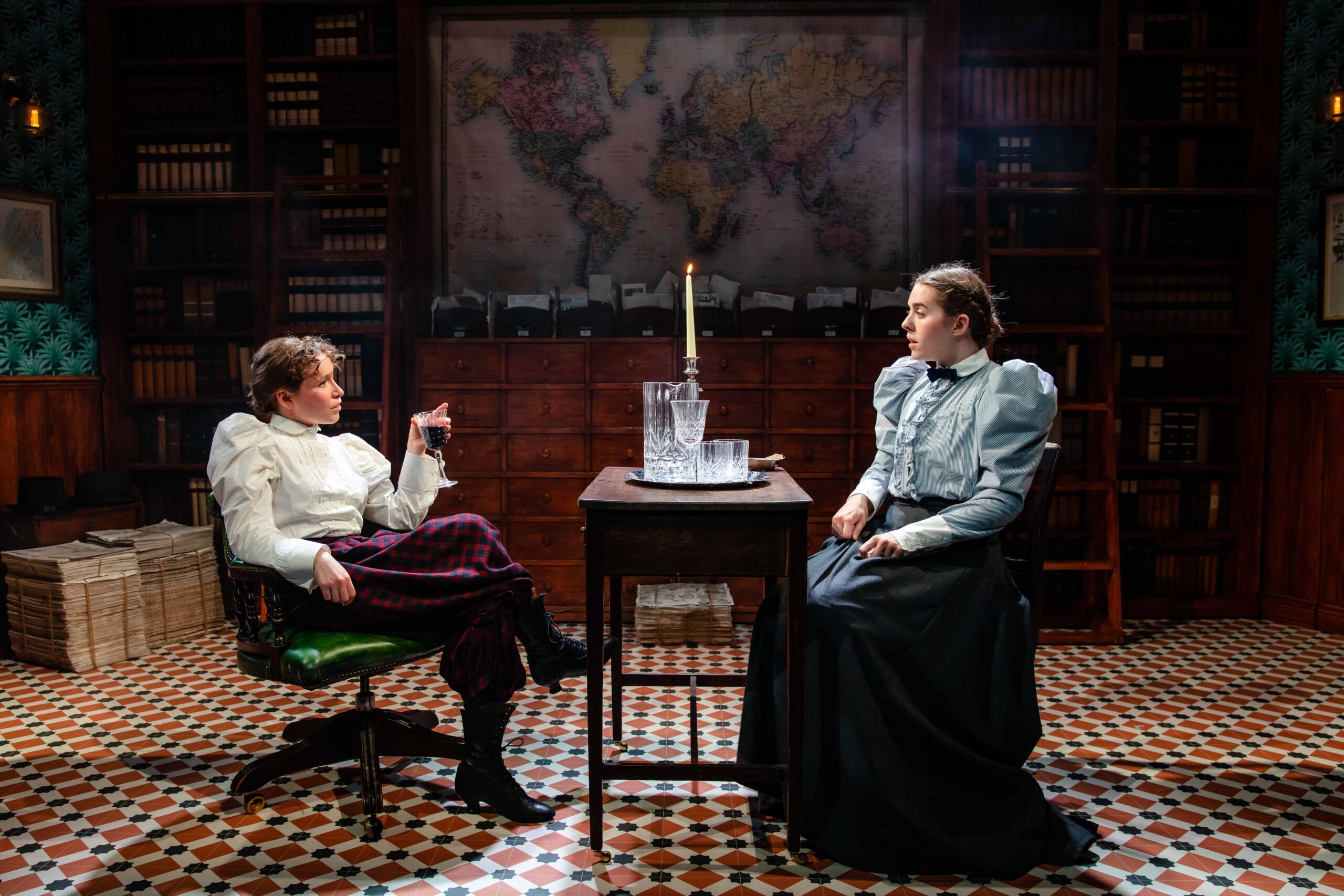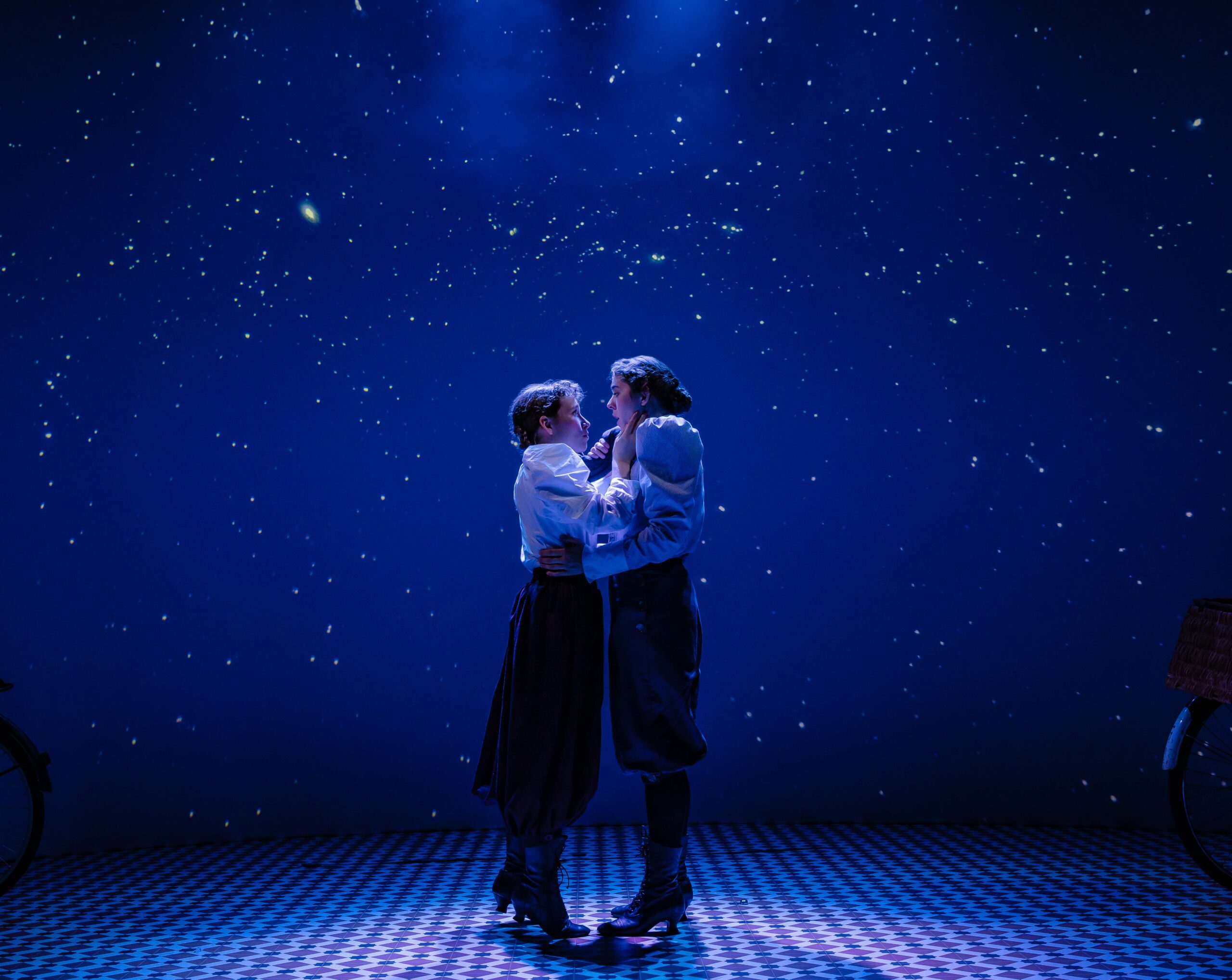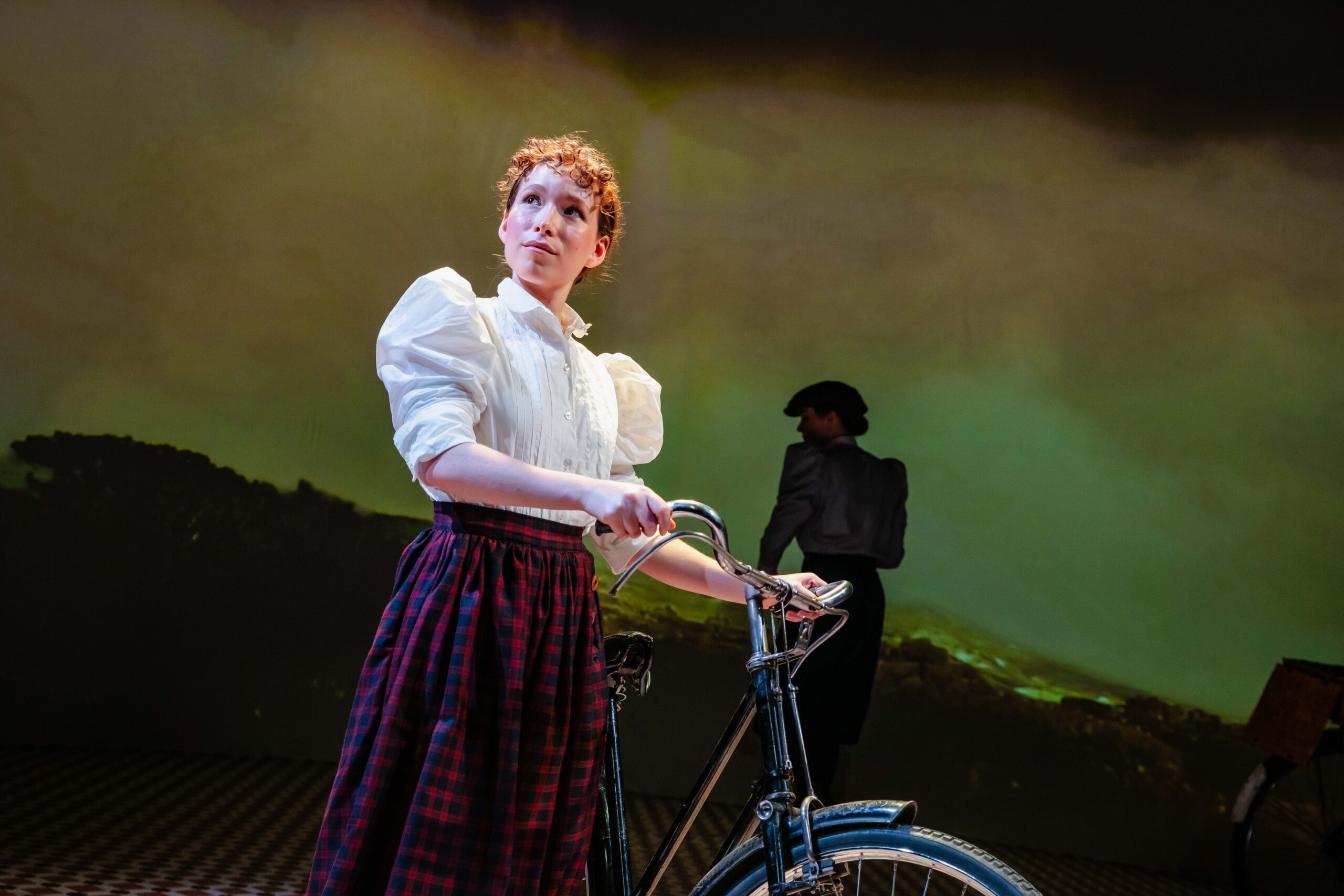 The leading duo deliver lively performances and their big voices, the choreographies and the amusing exchanges keep the energy high. The stage is used to good effect in spite of its limited proportions, with the Victorian furniture lending charm and few set devices making the space a little more dynamic. The bike as an object enters the scene relatively late in the play. Considering it’s the central element in the narrative, this choice comes across as odd. The entire production in fact treats Annie’s bike journey as a secondary matter.