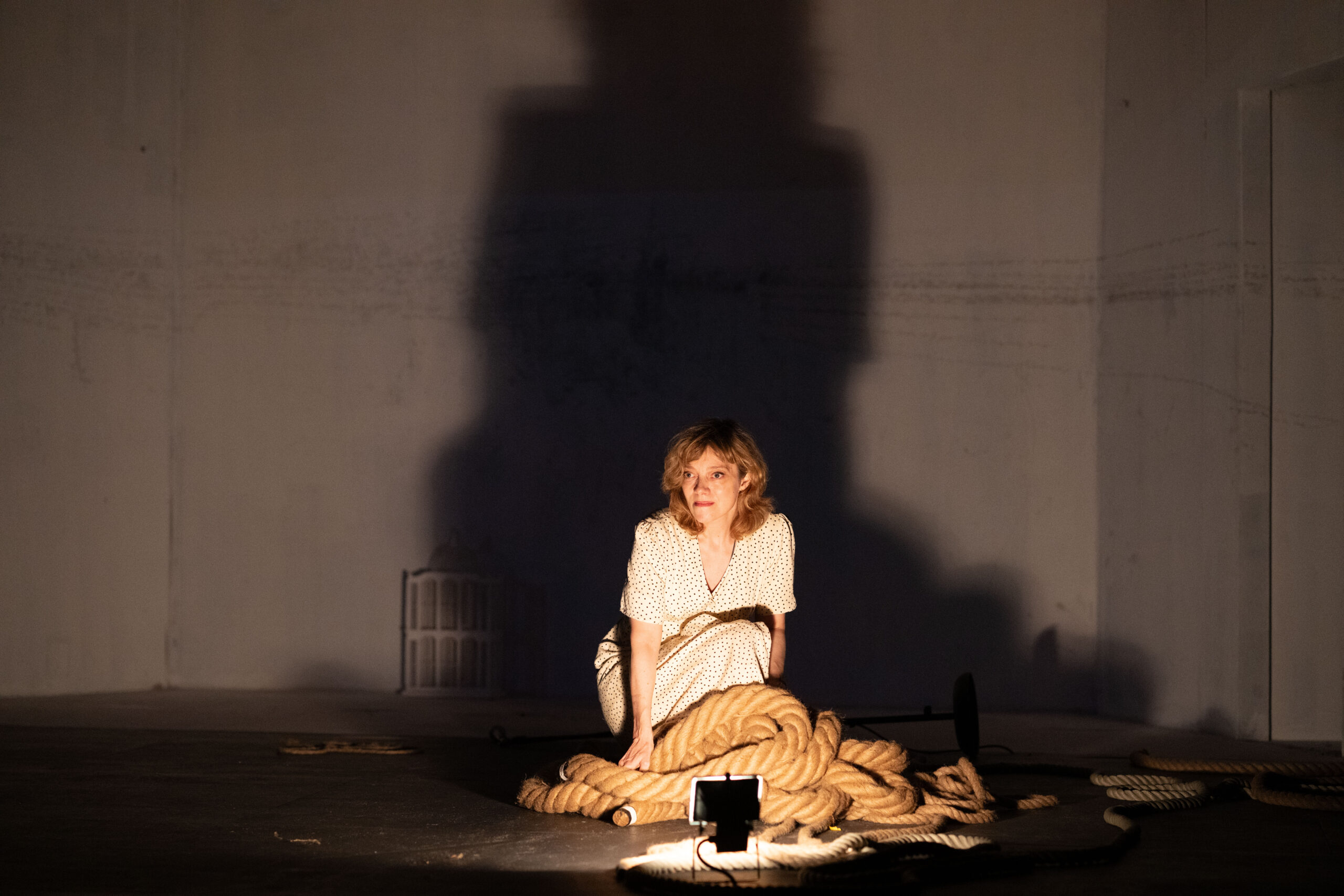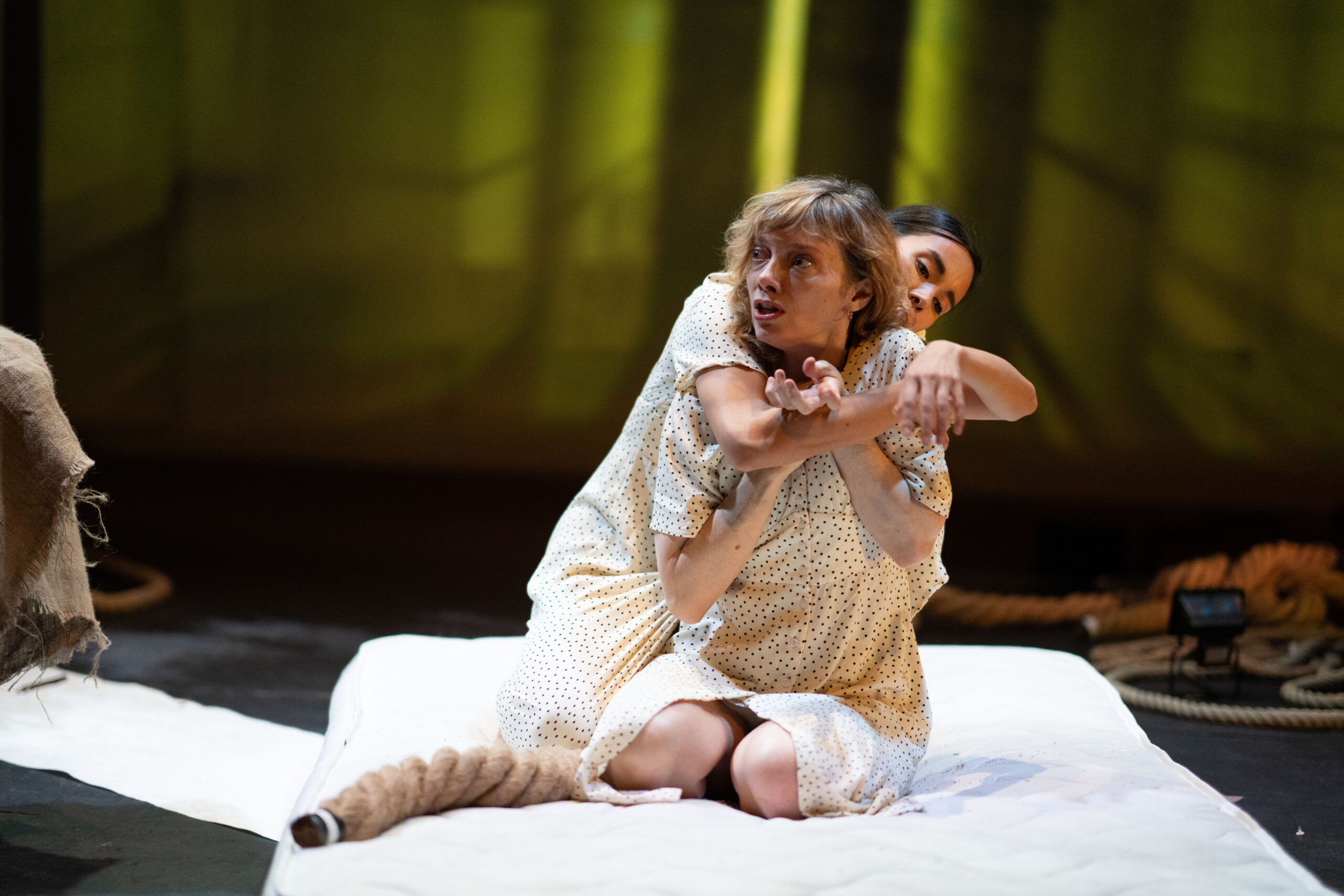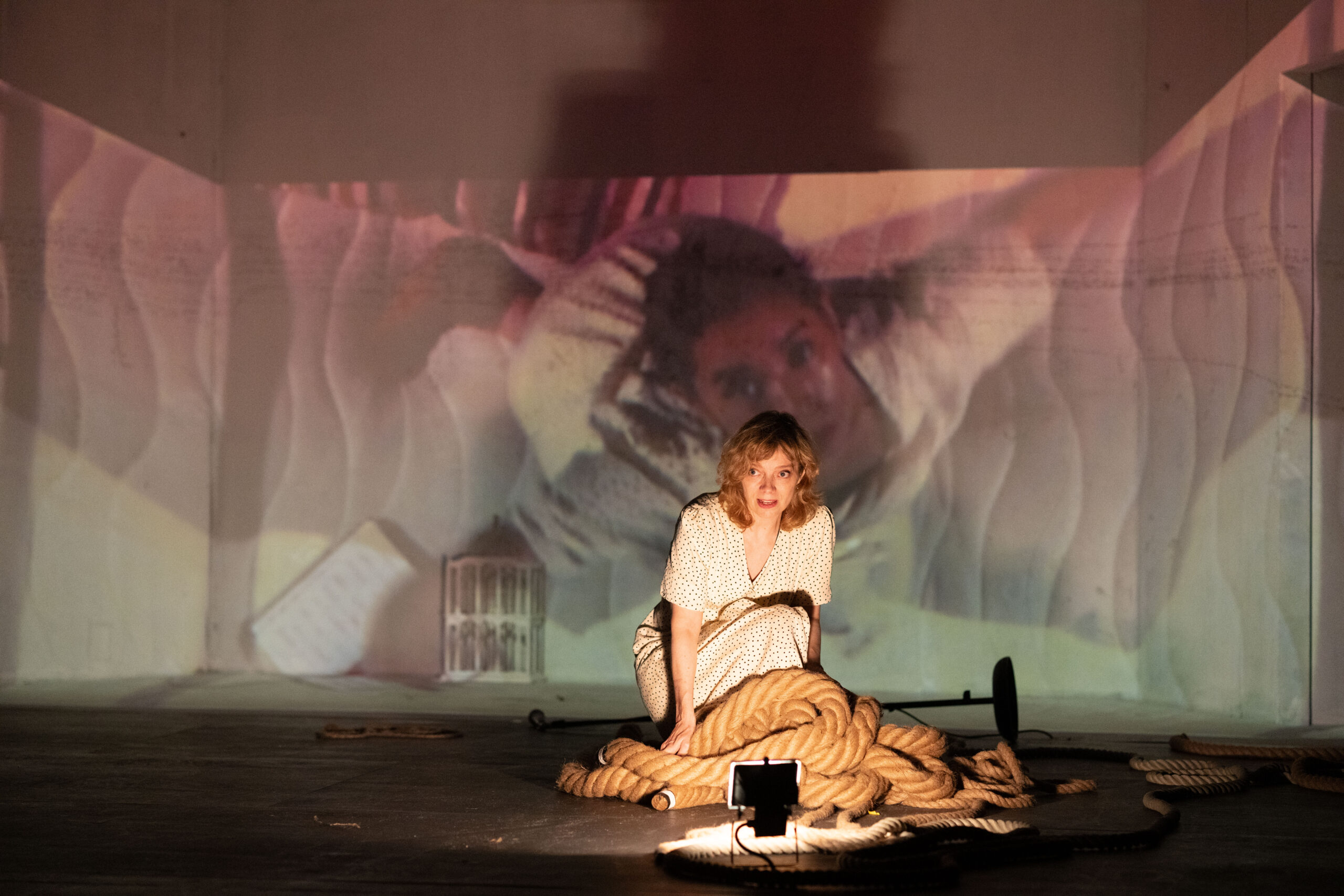 Mohr’s stage design is excellent. The stage is littered with ropes, a crib and pieces of cloth to create a sense of chaos that mirrors the uncomfortable nature of the narrator’s mind, while also fulfilling a symbolic function of representing her feeling of being tied up and worrying about her young motherhood. Takase’s choreography and dance, too, mirror the uneasiness: with a lengthy contemporary choreography, she portrays a sense of foreboding. It fits perfectly with the overall show. In a sense, the dancer and the narrator are two sides of the same coin, in the same way the woman the narrator sees behind the yellow wallpaper and herself are the same person.
