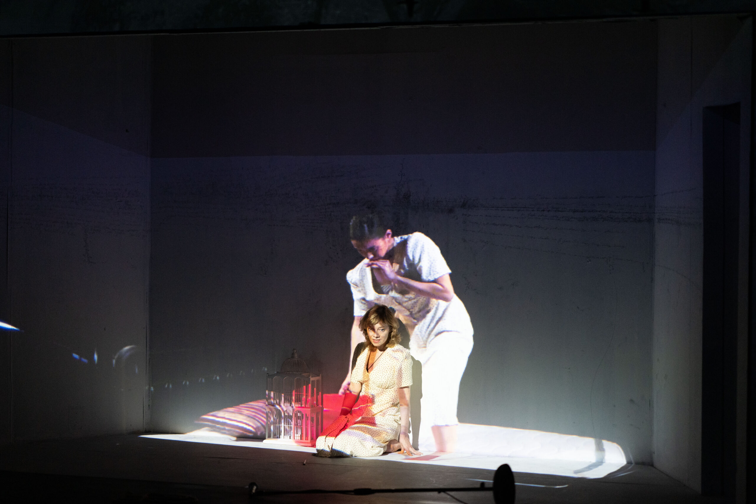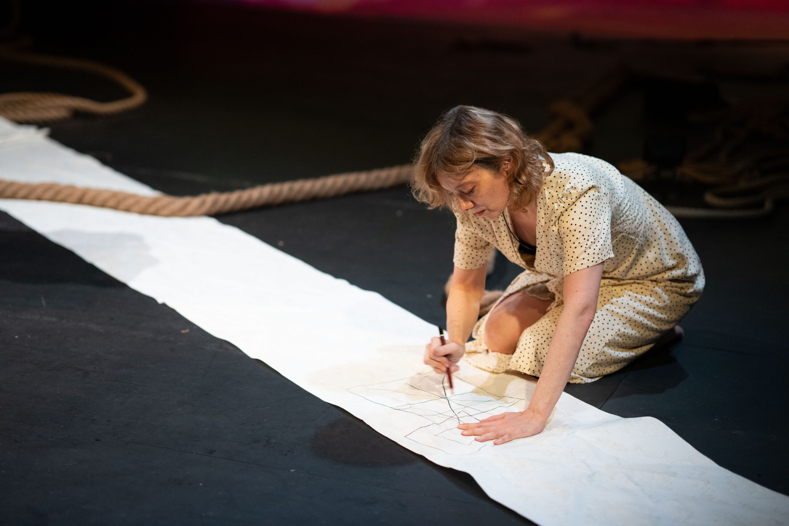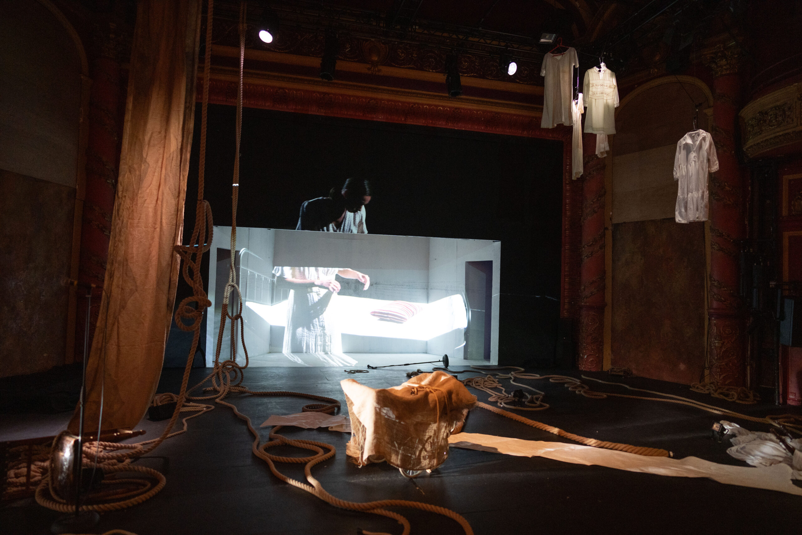 Mohr’s stage design is excellent. The stage is littered with ropes, a crib and pieces of cloth to create a sense of chaos that mirrors the uncomfortable nature of the narrator’s mind, while also fulfilling a symbolic function of representing her feeling of being tied up and worrying about her young motherhood. Takase’s choreography and dance, too, mirror the uneasiness: with a lengthy contemporary choreography, she portrays a sense of foreboding. It fits perfectly with the overall show. In a sense, the dancer and the narrator are two sides of the same coin, in the same way the woman the narrator sees behind the yellow wallpaper and herself are the same person.