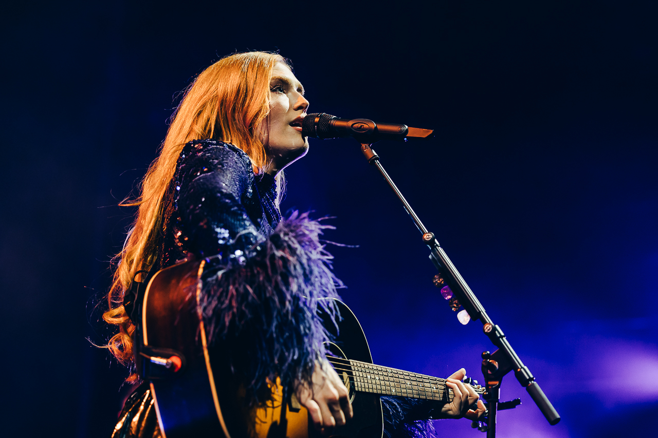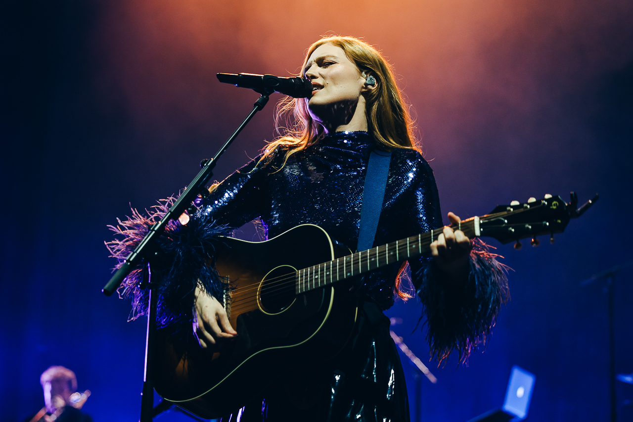 A yew tree filled with orange lights to represent the titular blood oranges stands at the back centre of the stage, creating a picturesque, fairytale element to Freya Ridings’s Blood Orange tour show. Further lights crisscross the stage, changing from royal blue and foggy light green during Weekends, before evolving throughout the night to suit the mood of the music. Ridings is a multi-instrumentalist and she begins the gig by swinging her hair and strumming the guitar, before moving to a piano.