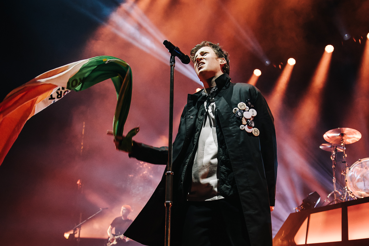 The stage unveils a car, surrounded by romantically lit trees, capturing the essence of upcoming album Parked Car Conversations, while vibrant colours and luminous effects complement the frontman’s sprightly performance. The concert begins with one of the band’s latest tracks, Red Lights. As the roar from the audience seems to charge him further, Ryan Hennessy can’t stop hopping in his iconic shuffle for Things Are Different: a beautiful piece indeed that displays the singer’s vocal range. Irish flags make their first appearance for When We Were Young and continue to wave high throughout the evening; not least, of course, during Ireland, a proud homage with the stage bathed in green, a motif reprised later in the set when Hennessy stands alone, illuminated by a single spotlight, as he delivers a traditional Irish anthem.