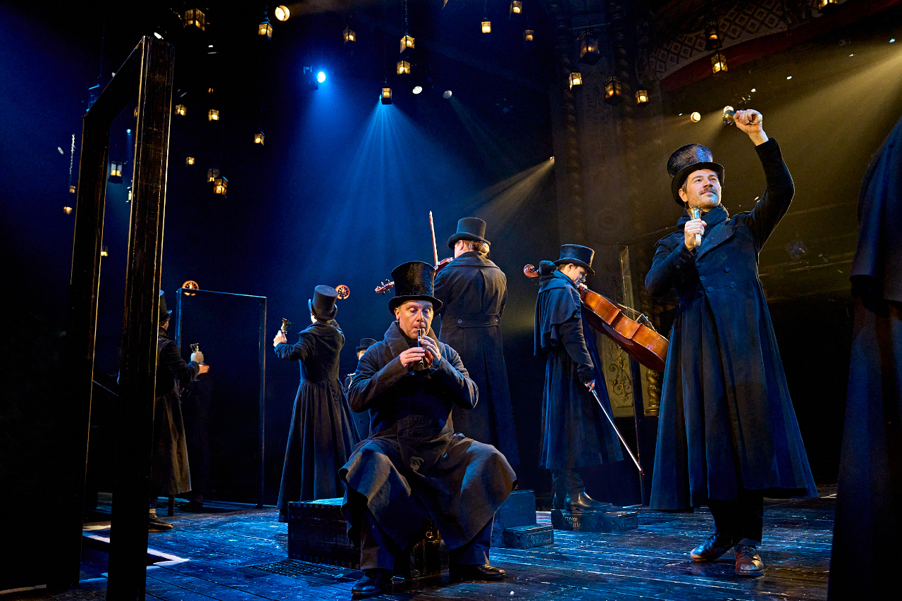 The stunning interior of the Old Vic, with the audience surrounding a cross-shaped wooden floorboarded stage, is lit atmospherically with hanging lanterns. Bell ringers in long black Victorian coats and top hats strike up friendly chitter chatter with arriving guests as they take their seats. Then all falls quiet as they start to ring the bells in perfectly choreographed timing.
