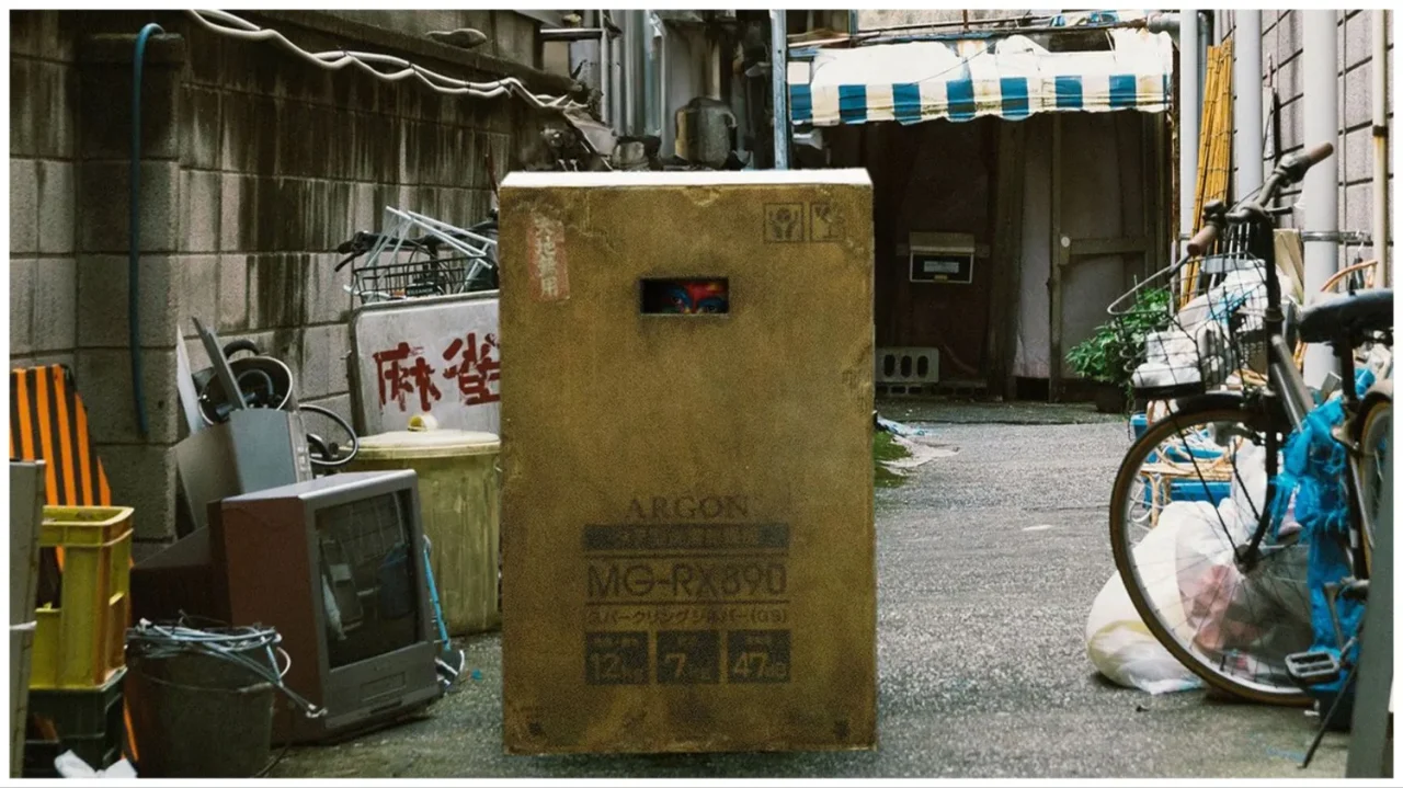 The Box Man commences with a few establishing shots on one of the Tokyo streets. It’s just another ordinary day in the Japanese capital, and people seem to calmly amble without any particular cause for concern. Yet, here, somewhere in the middle of one of the medium shots, we can spot a peculiarly looking box. It just stands there, somewhat helplessly, somehow tranquilly waiting for its personal Godot.